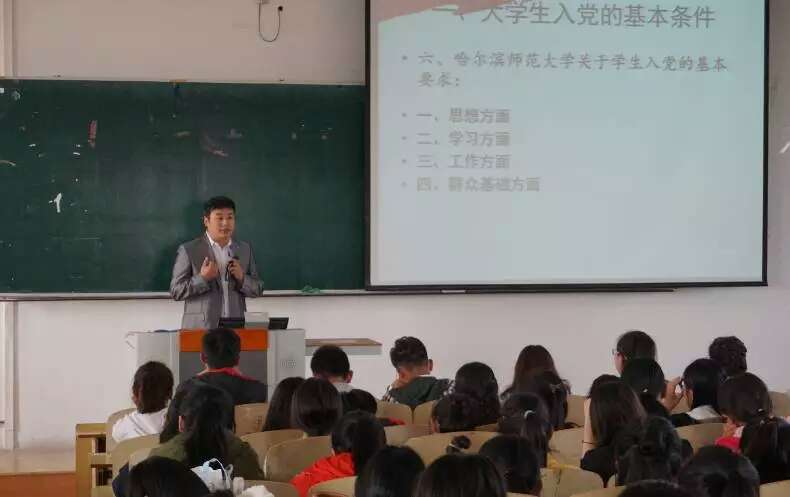 在学生入党方面的基本要求进行了阐述。随后,李书记对大学生入党的基本程序进行了具体介绍,强调了严格入党程序的重要意义,并就入党程序的各个阶段逐一进行说明。紧接着,李书记从各个方面向同学们介绍了如何以实际行动争取入党,要求同学们端正入党动机,时刻以党员标准严格要求自己。而后,李书记又对党员享有的权利和应履行的义务进行了说明介绍。