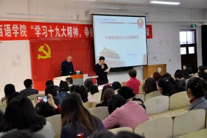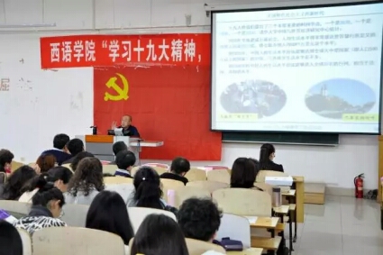 于西语楼451室召开学习十九大精神专题报告会,特邀马克思主义学院王林波副教授主讲,全体师生党员参会听取报告,报告会由学院党委书记李贵彬主持。