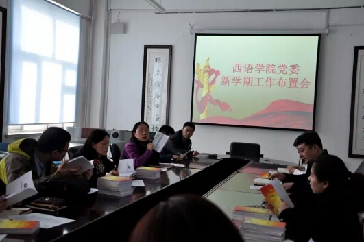党委于2018年4月11日在西语楼211室召开工作布置会。学院党委书记李贵彬、党委副书记刘春玲,副处级辅导员杨晓明以及各党支部书记出席了本次会议,会议由李贵彬主持。