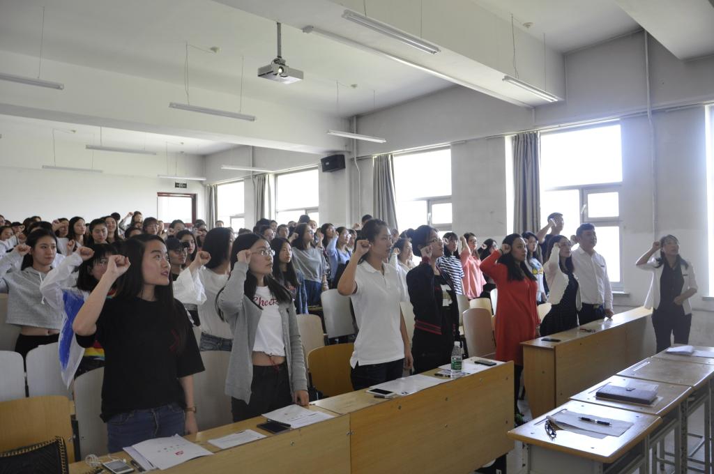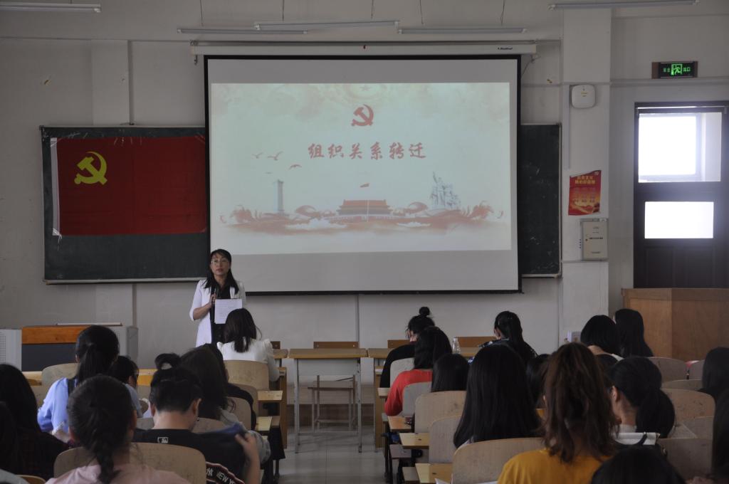 “重温入党志愿书,重温入党谈话,重温入党誓词”三重温环节中,学院选取党员代表研究生王莹和本科生王丹妮重温入党志愿书并宣读入党志愿书,在老师的带领下每名党员都重温了入党志愿书;刘春玲副书记带领大家重温入党谈话,提出三点希望:一、不忘初心,坚定信仰,不断端正入党动机,不断改正自己的主观世界,加强理论学习;二、牢记使命,树立全心全意为人民服务的思想,为同学,为学校服务,毕业前站好最后一班岗;三、争当表率,文明离校,在自己的岗位上再创佳绩。杨晓明老师带领全体党员在党旗前共同重温了入党誓词。最后,杨晓明老师向各位党员详细解读毕业生党员组织关系迁转工作的通知以及学院相关安排。