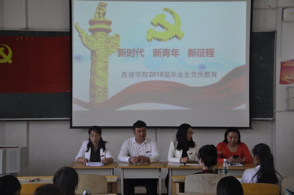 教育会议分毕业生专题党课、党员提示卡发放和“三重温”等环节。专题党课环节中党委书记李贵彬为即将迈入社会的全体毕业生党员讲授了主题为《深入领会习近平新时代中国特色社会主义思想》和《关于新形势下党内政治生活的若干准则》的专题党课。李贵彬为毕业生党员详细讲解了习近平新时代中国特色社会主义思想的形成背景、丰富内涵、指导意义;解读了《准则》的制定背景、重点和关键、党内政治生活中出现的一些突出问题,新形势下如何过好党内政治生活的等。最后,对毕业生党员提出了不忘初心,牢记使命;铭记校训,砥砺前行;树立榜样,贡献力量;西语为家,永远守望等期望祝福。