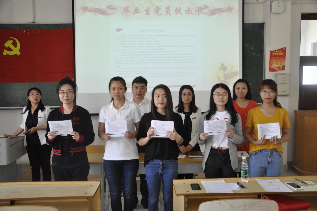 毕业生党员提示卡发放环节中,杨晓明老师对党员提示卡的内容做了详细说明,参会老师为毕业生党员发放了党员提示卡,提示所有学生党员:要牢固树立“四个意识”和“四个自信”;要不断增强党的意识,时刻牢记自己第一身份是党员;要自觉遵守党的纪律;严格执行组织生活有关规定,从严要求自己;及时转签落实组织关系。
