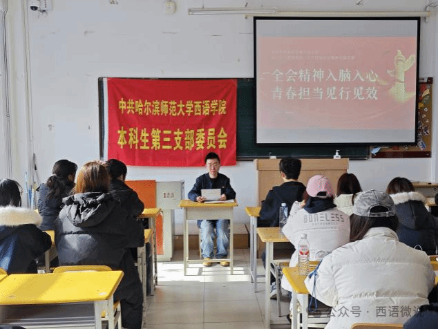 本科生第三党支部于3月3日在西语楼350教室组织开展“全会精神入脑入心 青春担当见行见效”专题党课。本次党课由党支部书记蒋雨材主讲,党支部全体党员参加学习。