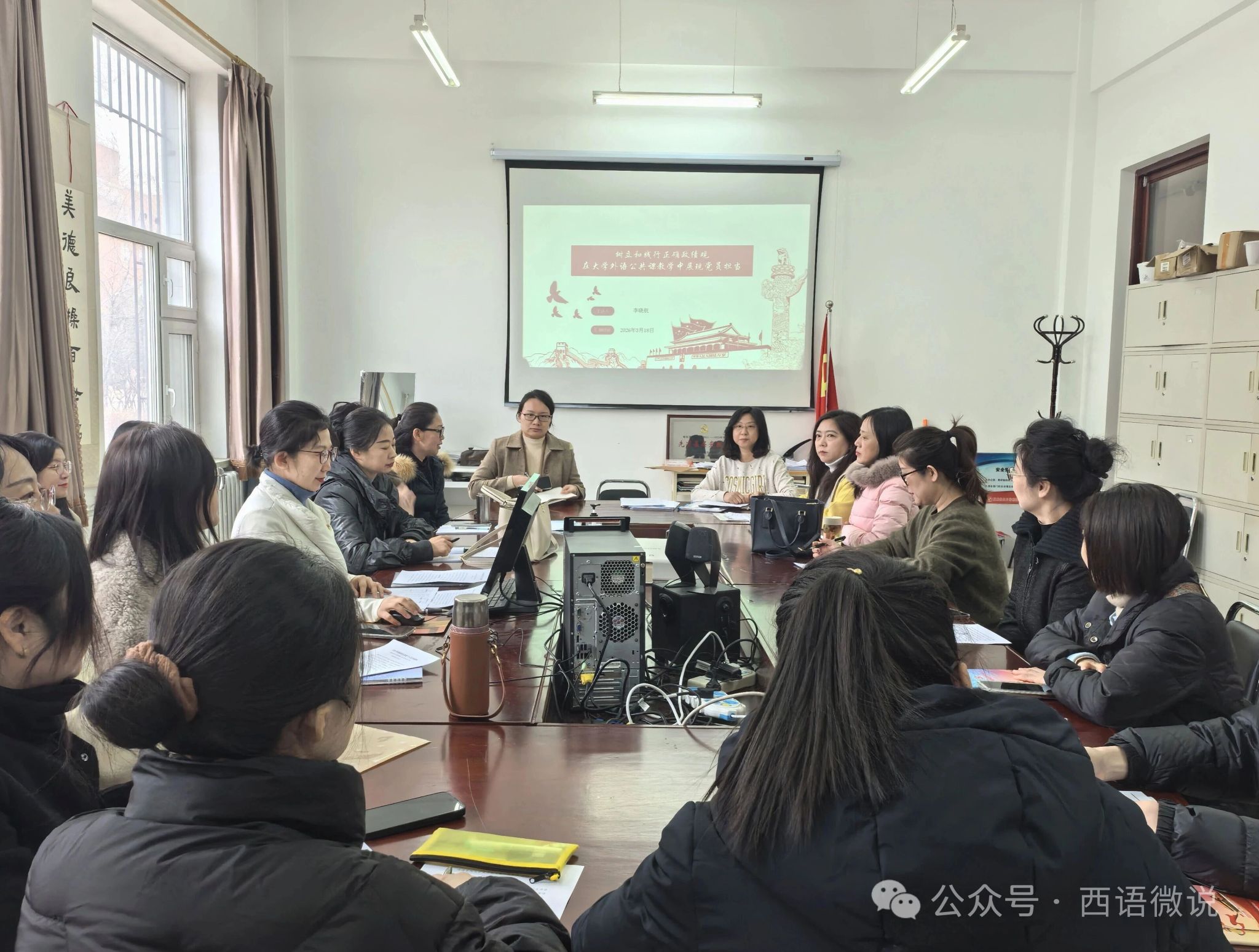 党委书记李晓航在西语楼139室以“树立和践行正确政绩观,在大学外语公共课教学中展现党员担当”为题,为全体公共外语教师党员讲授专题党课,会议由党支部书记裴云红主持。