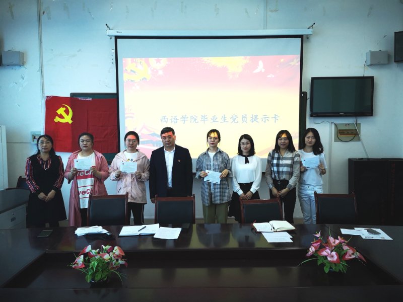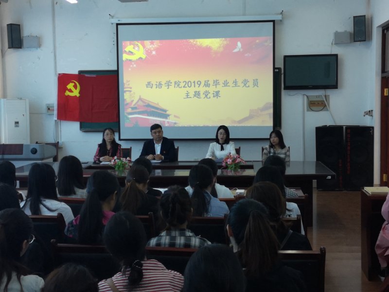 第三环节开展了“感恩 奉献 报国”专题党课,党委书记李贵彬为即将迈入社会的全体毕业生党员讲授了主题为《中国共产党支部工作条例(试行)》的专题党课。李贵彬为2019届毕业生党员详细讲解了党支部工作条例的制定背景、制定意义;解读了《条例》的重要内容,就工作机制方面,他强调毕业生党员要牢记党的工作机制——“三会一课”即党员大会、支委会、党小组会和党课。最后,对毕业生党员提出了不忘初心,牢记使命;铭记校训,砥砺前行;树立榜样,贡献力量;西语为家,永远守望等期望祝福。