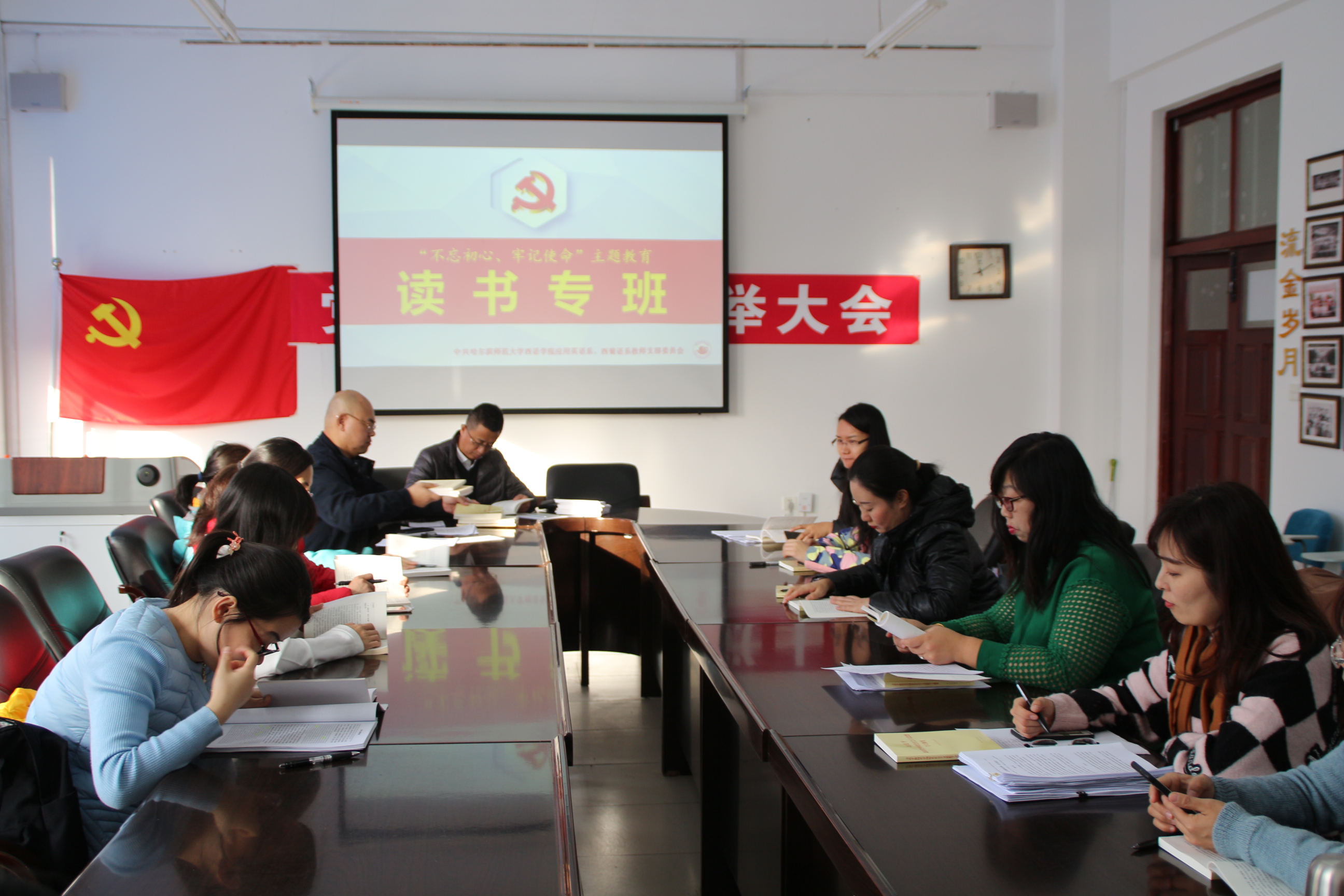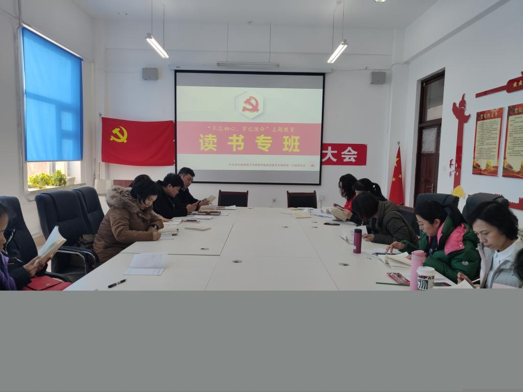 本次主题党日采取读书专班的形式,围绕《习近平关于“不忘初心、牢记使命”论述摘编》和《习近平新时代中国特色社会主义思想学习纲要》开展,在支部的学院党委委员和支委会成员担任领学,分别领读《摘编》和《纲要》中坚持以人民为中心、推进社会主义文化繁荣兴盛、把党建设得更加坚强有力等重点内容。领读领学后党员又进行了集中自学,党支部布置了党费收缴和主题教育未来工作,反馈了《摘编》督学情况。