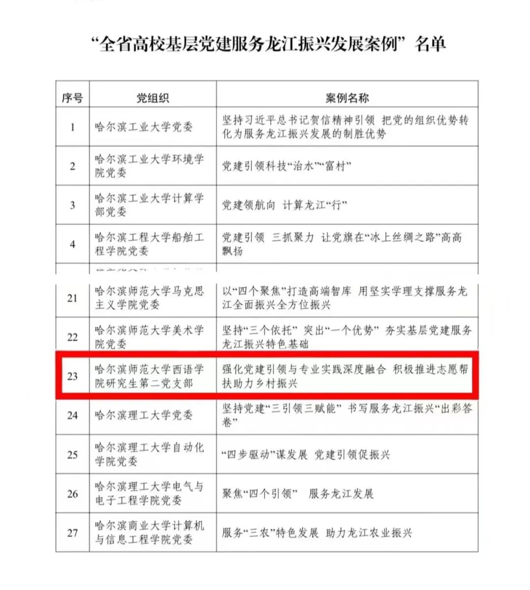 研究生第二党支部《强化党建引领与专业实践深度融合积极推进志愿帮扶助力乡村振兴》成功入选“全省高校基层党建服务龙江振兴发展案例”。