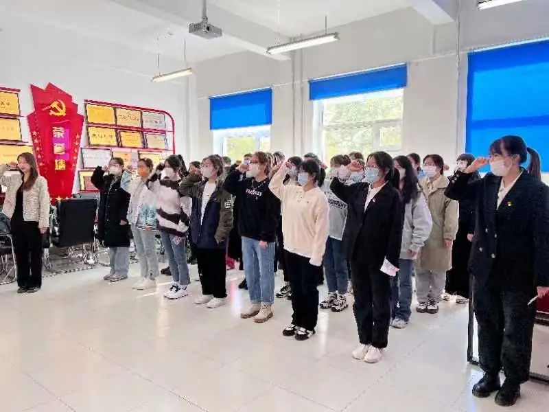2022年新转入党员辅导员张雨石老师带领全体党员重温入党誓词,所有人面向党旗,高举右拳,郑重宣誓:“我志愿加入中国共产党,拥护党的纲领,遵守党的章程,履行党员义务,执行党的决定,严守党的纪律,保守党的秘密,对党忠诚,积极工作,为共产主义奋斗终身,随时准备为党和人民牺牲一切,永不叛党。”