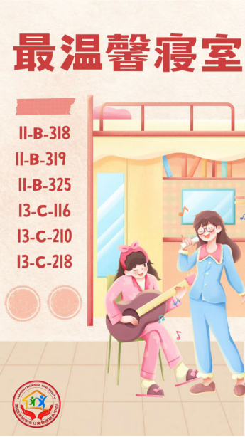 于2024年11月13日举行了“寝”心合力,“舍”影留香寝室合照大赛。参赛寝室的合照风格多元,本次比赛特设了“最整洁奖”、“最温馨奖”、“最具学习氛围奖”三大奖项。经过工作人员公正严谨的评选,现将评选结果进行公示: