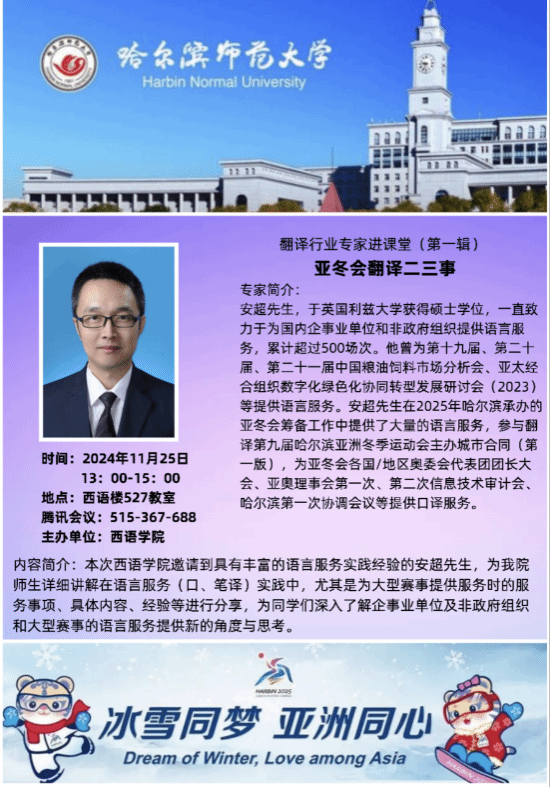 邀请职业译员安超先生为MTI师生做了题为“亚冬会翻译二三事”的讲座,是学院举办的翻译行业专家讲座的第一辑。iqqtv