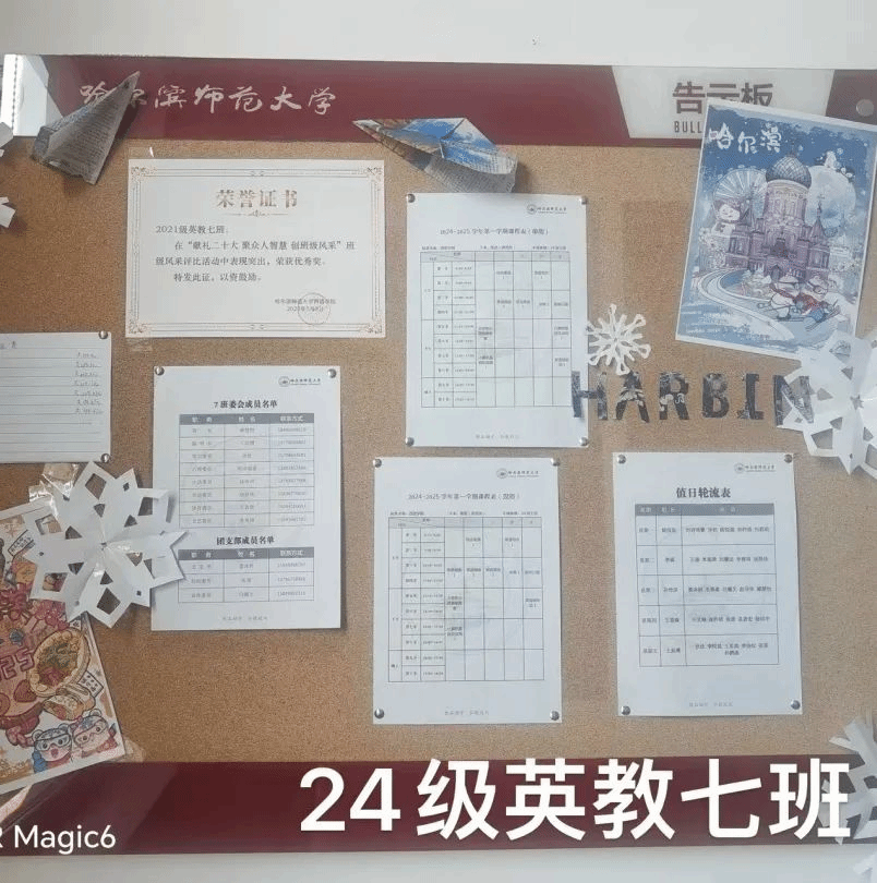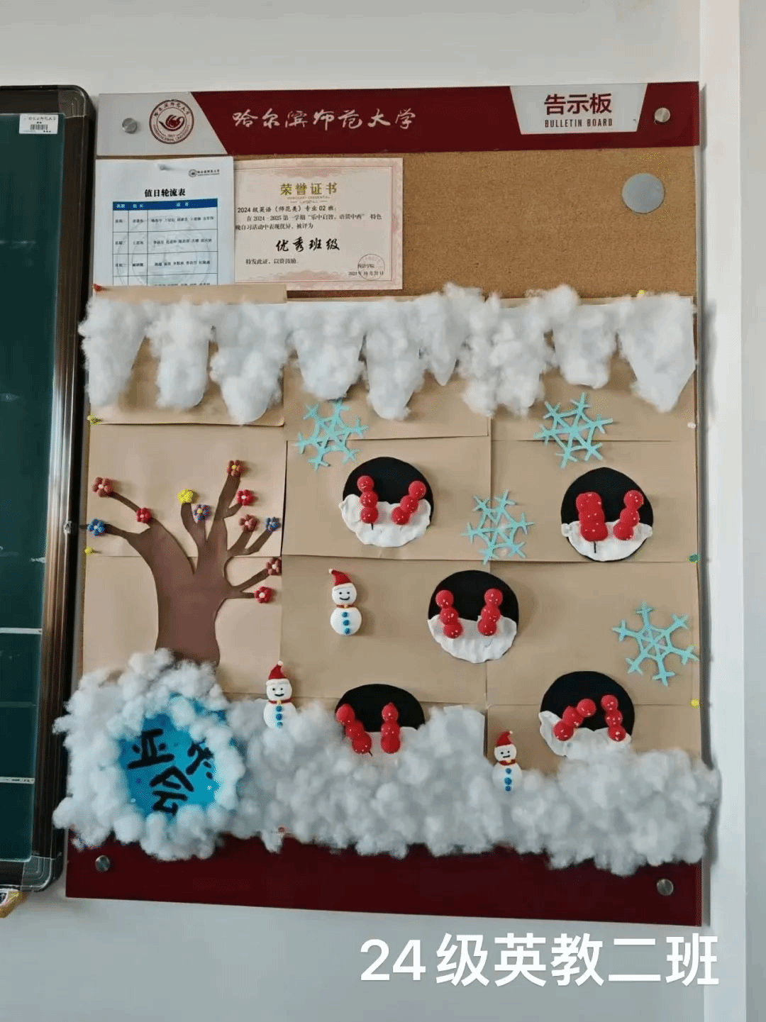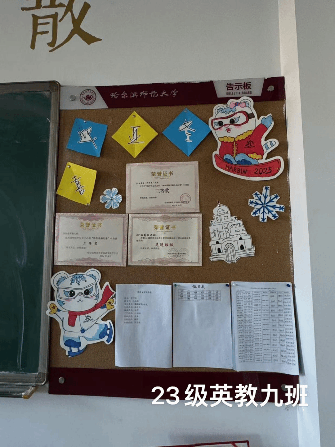 各班对本次活动十分重视,在整个布置活动中,同学们充分发挥自己的想象力和创造力,积极参与每一个环节。擅长绘画的同学绘制了精美的板报,充分体现了亚冬会的主题,栩栩如生的吉祥物更是给班级增添几分活力。手工制作达人制作出了别具一格的装饰品,充分体现审美,融合了冰雪元素让教室焕发出勃勃生机。一尘不染的教室不仅为同学们提供更好的学习环境,更体现了班级昂扬的精神风貌。