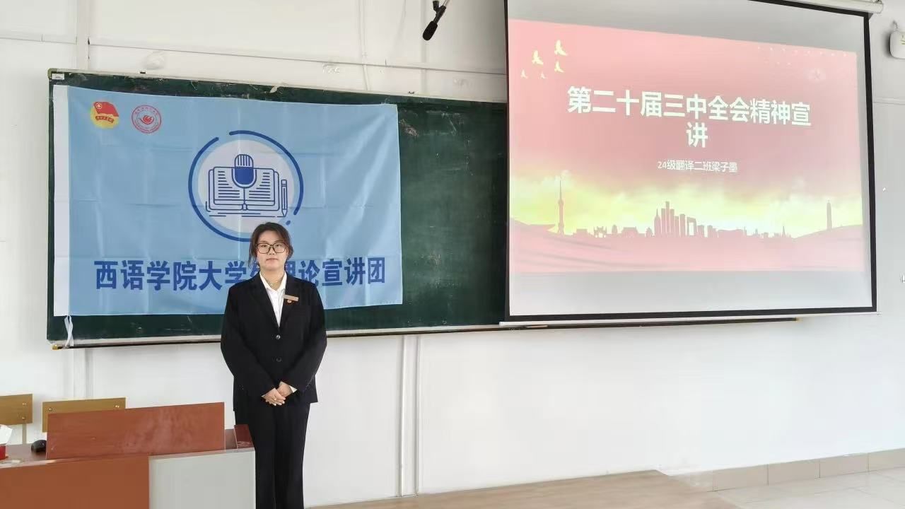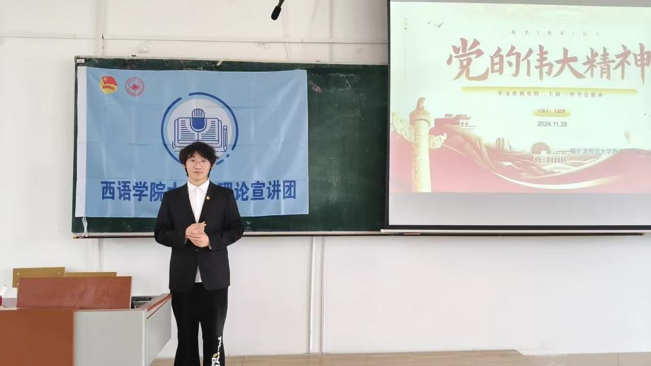 第二届大学生理论宣讲团于12月在西语楼503教室开展了以“领航新征程:学习贯彻党的二十届三中全会精神”为主题的第三期宣讲活动。本次活动由宣讲团成员王起博、吕欣泽、梁子墨三位同学进行宣讲。