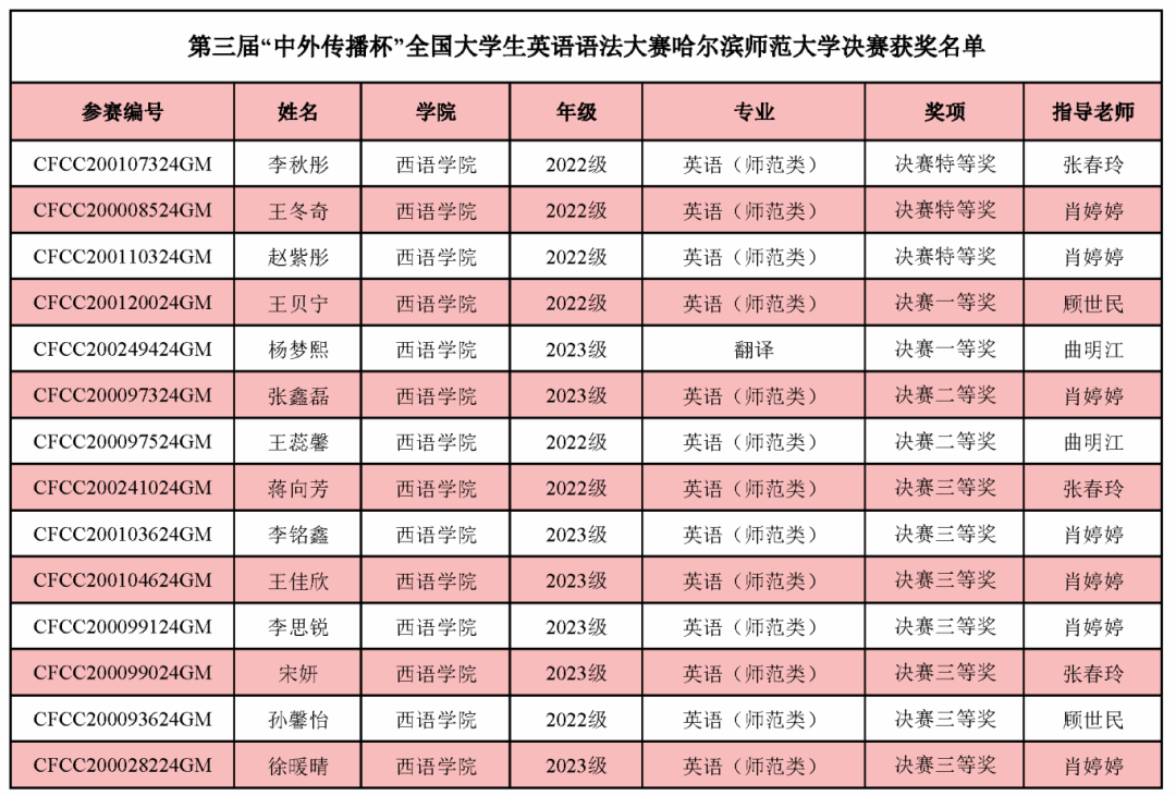 决赛于3月2日19:00-20:00在西语楼 403 教室举行,经过激烈的角逐,共有14名同学斩获佳绩。王冬奇等同学凭借扎实的英语语法功底摘得决赛特等奖,王贝宁等同学荣获决赛一等奖,张鑫磊等同学拿下决赛二等奖,蒋向芳等同学收获决赛三等奖。