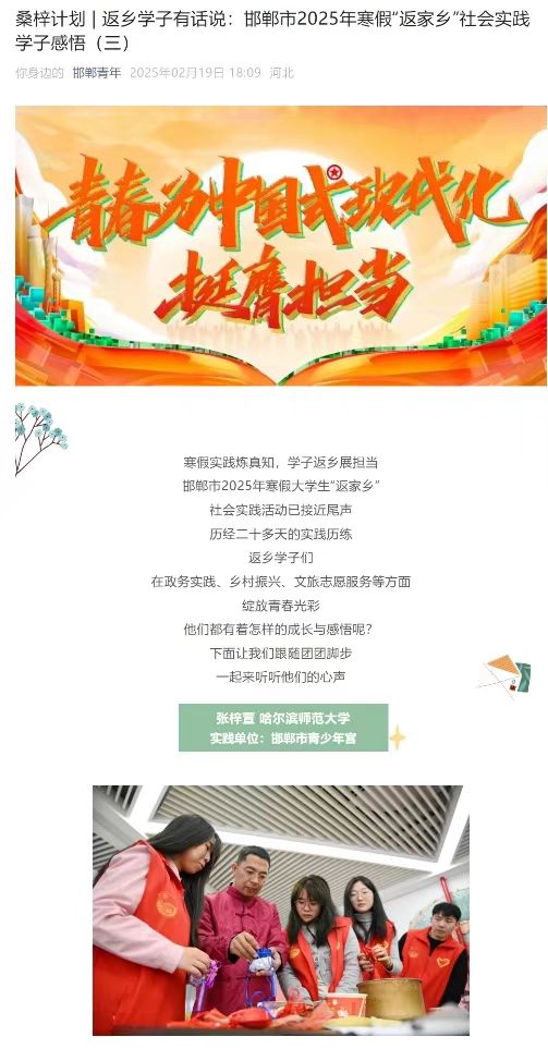 共先后组建“我的师大我代言”母校回访及宣传主题项目,“党的二十届三中全会精神”学习宣讲项目,“返家乡,做贡献”社会实践活动,传承中国共产党人精神谱系,寻访红色教育基地,“走进家乡,传承文化”文化调研项目共5类246支团队,分别前往黑龙江省伊春市,广东省深圳市,河北省邯郸市,贵州省贵阳市等19省93市开展寒假社会实践活动。在众多社会实践团队中,iqqtv