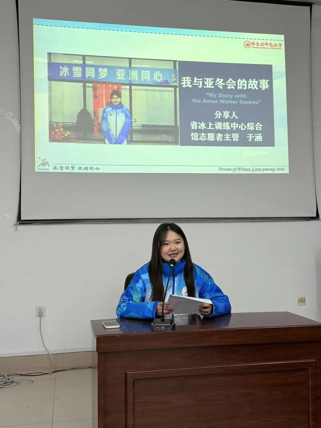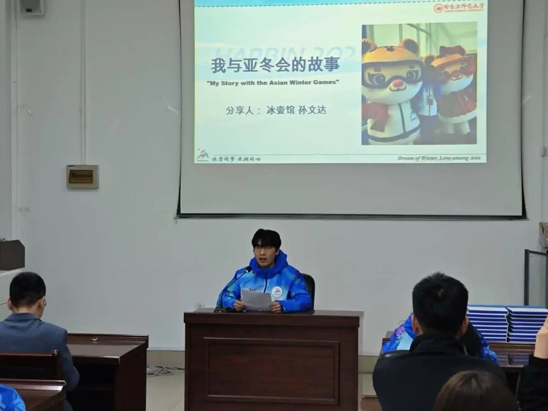 志愿者代表亚冬会省冰上训练中心综合馆志愿者主管于涵、升旗手郭海森、礼仪队史吴雨阳及冰壶馆志愿者孙文达、何璇以亲身经历,分享了参与志愿服务期间与亚冬会的故事。每一个故事都沉淀着热爱,此次经历更是将雷锋精神与亚冬精神作为宝贵精神财富,薪火相传,激励后来者继续前行。