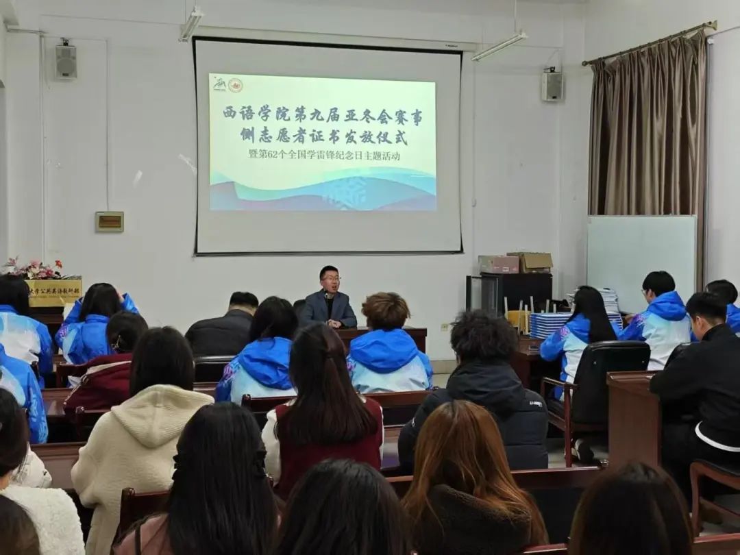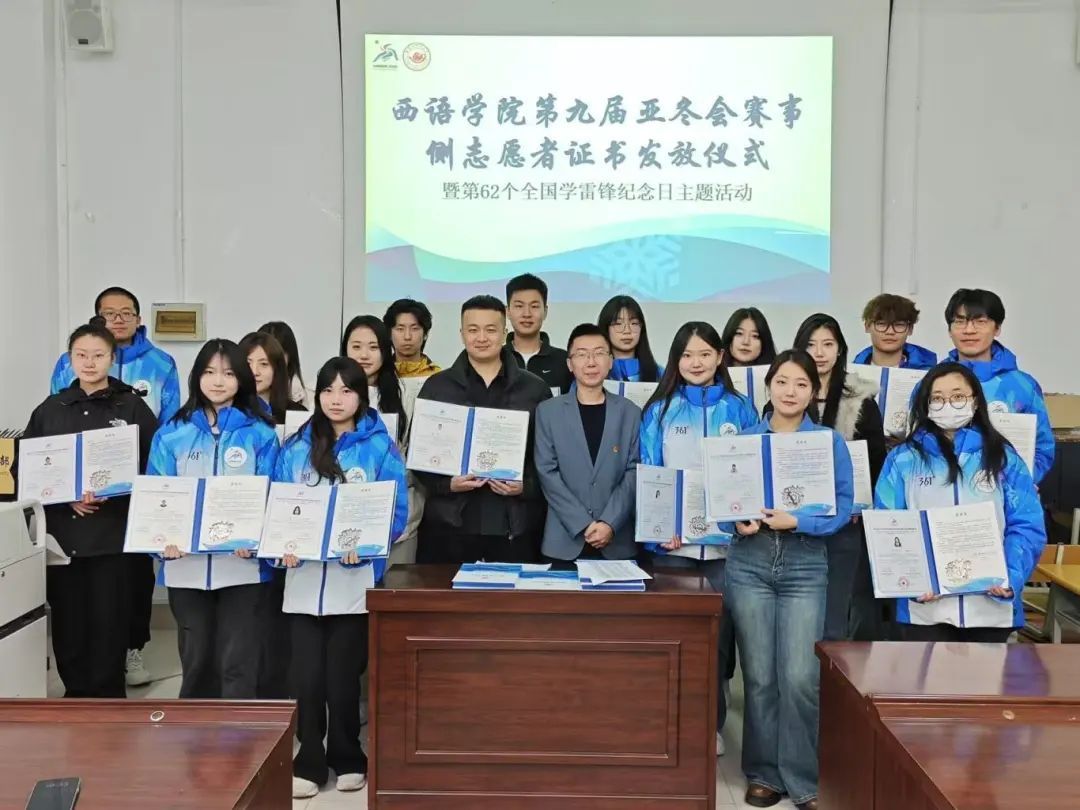 于3月10日在西语楼109会议室举办第九届亚冬会赛事侧志愿者证书发放仪式暨第62个全国学雷锋纪念日主题活动。带队教师魏一扬、于涵,以及部分志愿者和学生干部代表参加,本次活动由学院青年志愿者协会指导教师蒋雨材主持。
