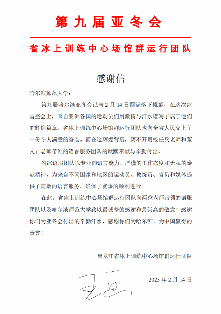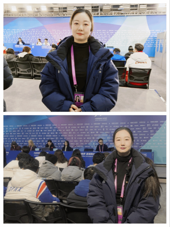 董老师坦言,参加本次亚冬会语言服务工作让她深刻体会到,国际赛事不仅是语言能力的考验,更是跨文化领导力与资源整合能力的综合战场。这段工作经历既是对她个人专业能力的全面检验,也是一次宝贵的国际化视野拓展机遇,更是对她意志和精神的一次巨大考验。她将持续精进体育外交语言服务专业能力,持续提升自身素养,在未来的语言服务领域中追求更高标准,助力中国冰雪运动的国际传播事业,为大型国际赛事贡献力量。