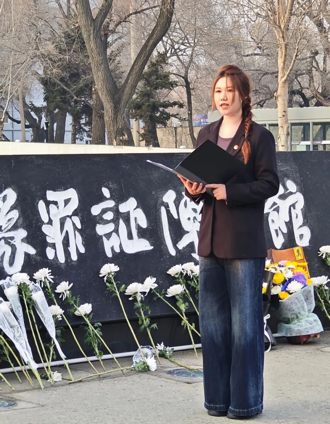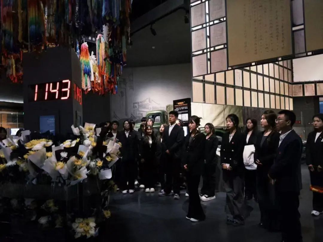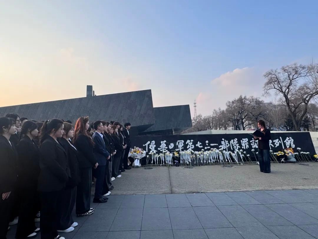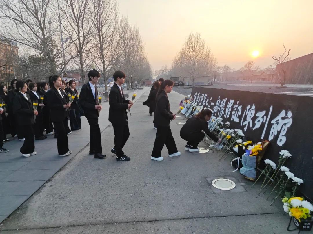宣誓完毕,全体师生代表在陈列馆前举行献花仪式。师生们手持鲜花,庄重地走向纪念碑,献上花束,向战争中遇难同胞及英勇抗争的先烈致以崇高敬意。献花仪式在肃穆氛围中进行,师生默哀,表达对历史的铭记和对和平的珍视。