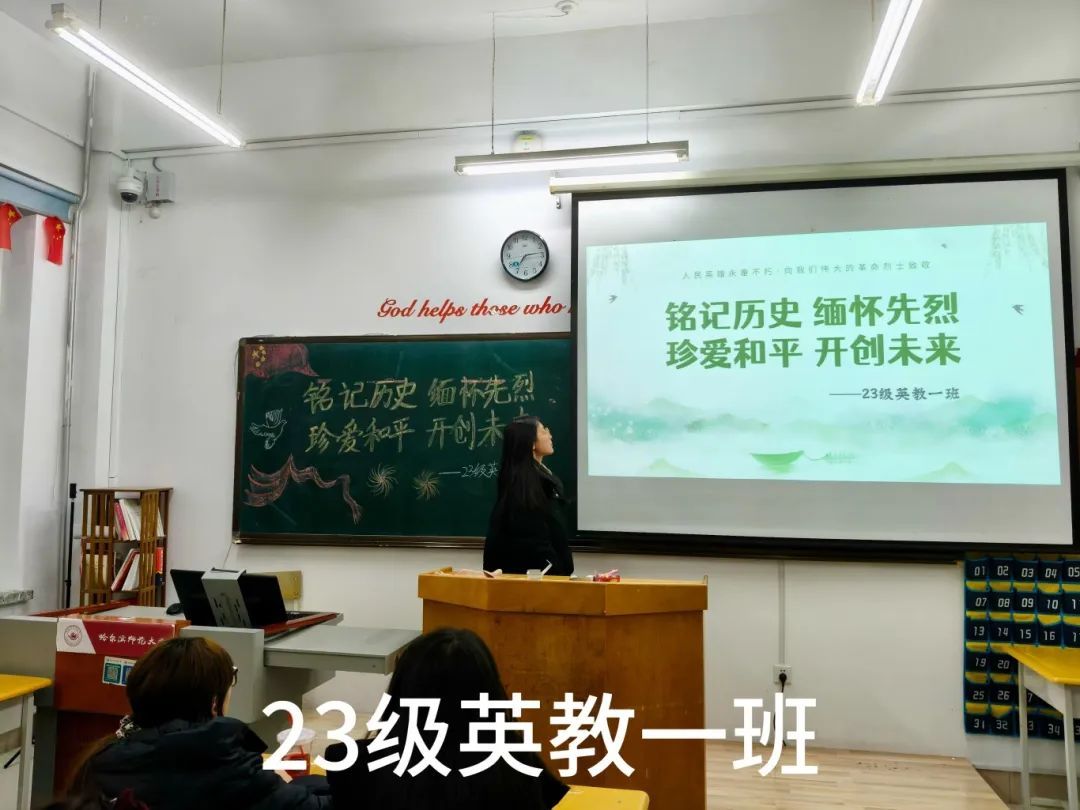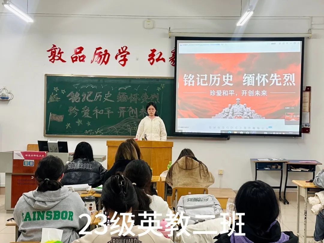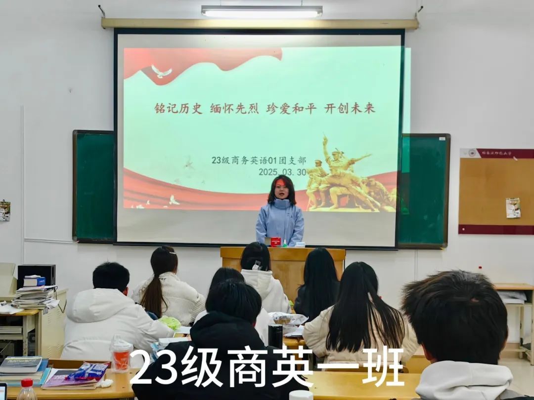 各班团支书利用丰富的影像资料,借助精美的PPT来激发同学们的爱国热情,并呼吁同学们传承和弘扬英烈精神,坚定必胜信念,发扬斗争精神,营造出崇尚英雄、缅怀先烈的浓厚氛围。