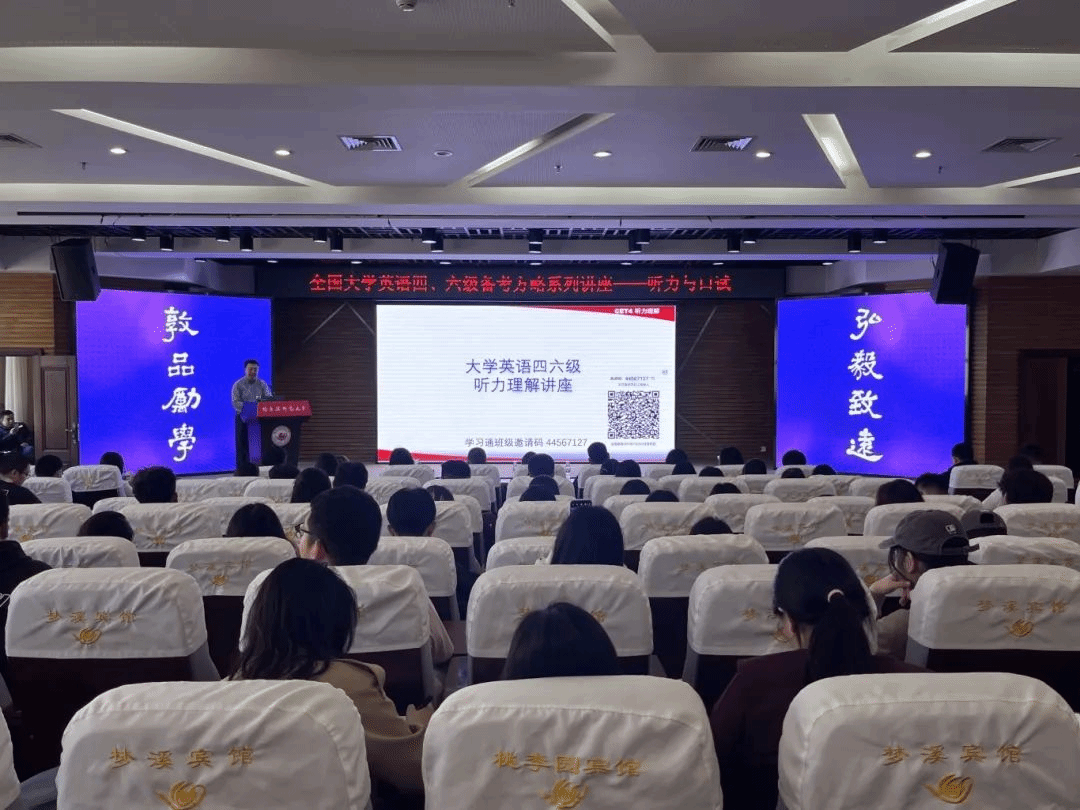 大学英语第二课堂品牌活动之一,我院联合学校教务处坚持面向全校学生定期举办大学英语四、六级备考系列讲座,切实贯彻“以学生发展为中心”的服务理念。近年来,学院围绕四、六级考试纲要,构建了“必修课-选修课-公益讲座”三位一体的教学模式,并依托“全国大学生英语竞赛”、“词达人杯”词汇赛、“国才杯”演讲写作大赛等赛事开展竞赛培训,全面助力学生提升英语应用能力。未来,学院将继续推出更多优质语言服务,为培养具有国际视野的高素质人才贡献力量。