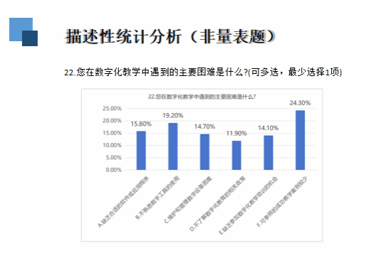 于今年3月份发放了针对全体大学英语教师的调查问卷。该问卷设计基于教育部于2022年发布的《教师数字素养》的框架维度,包括5个一级维度和13个二级维度,分别指向教师的数字化素养、数字技术知识与技能、数字化应用、数字社会责任及专业发展。问卷的结构包括量表问题与开放性问题。数据回收后进行了整理,分别做了描述性分析、差异性分析、相关性分析及影响因素分析,力求客观反映目前我校当前大学英语教师数智化教学素养的全貌。