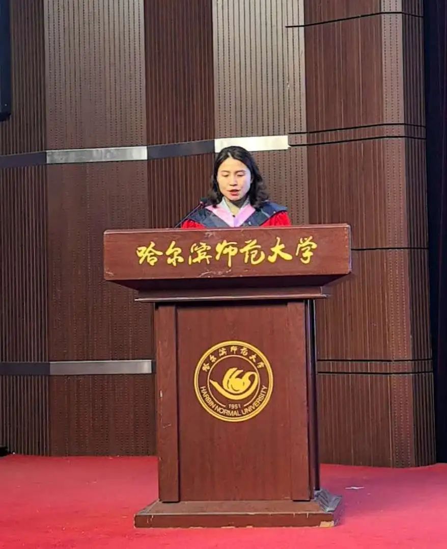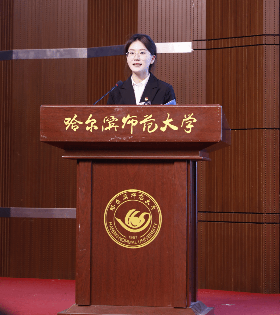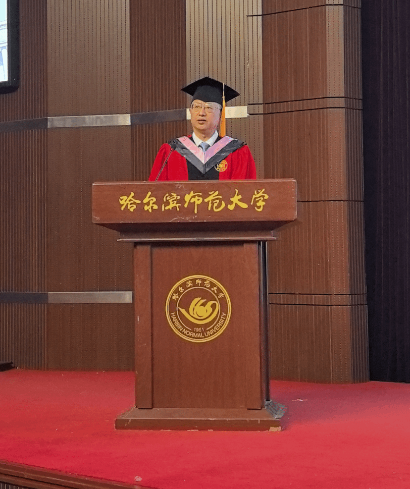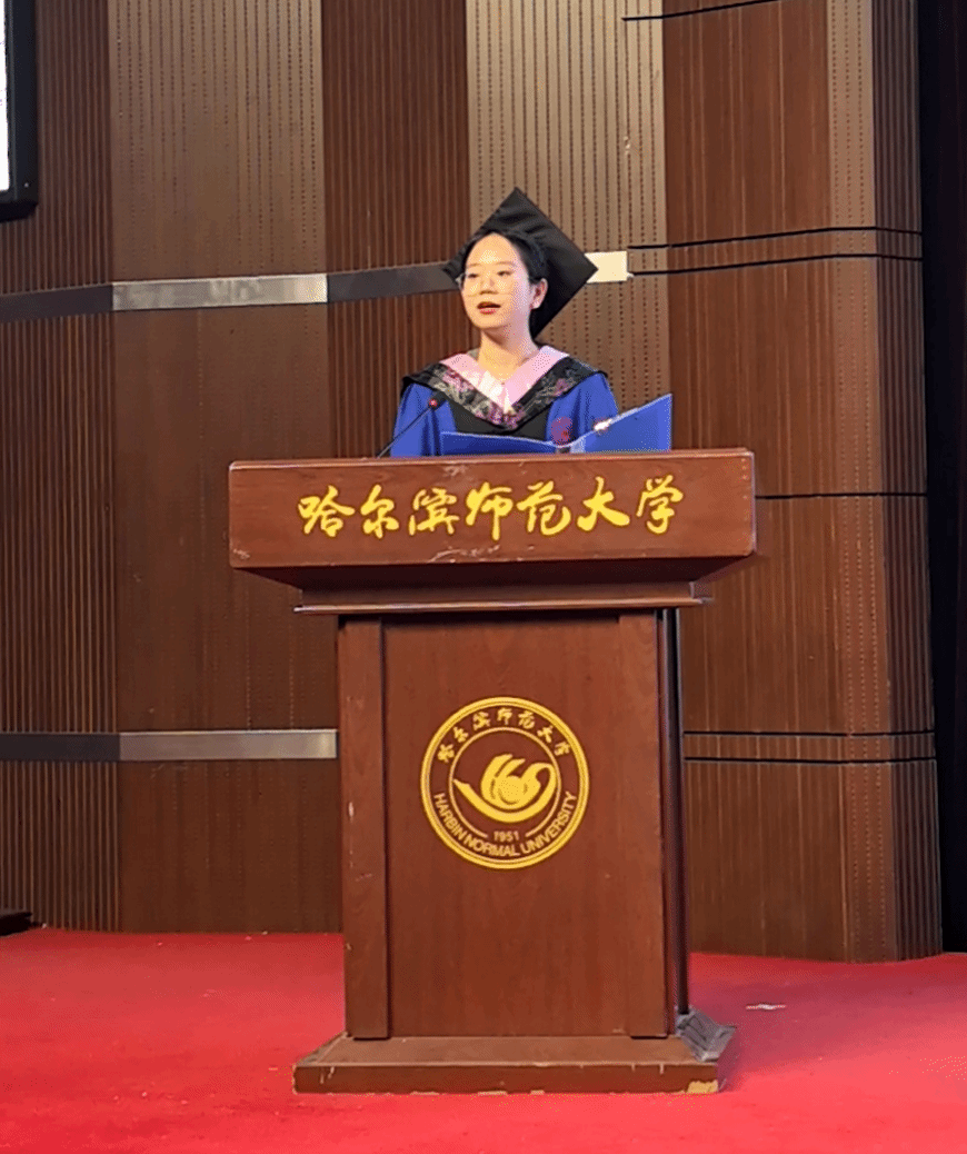 的憧憬,感恩学院师长严谨治学、倾囊相授,同窗携手奋进、共探学术。身为党员,他牢记“传播中国声音”的使命。以登山喻学术路,感恩母校教师如灯塔引航。最后,他号召带着母校精神与文化行囊,勇赴星辰大海,在世界舞台标注哈师大人的高度。
