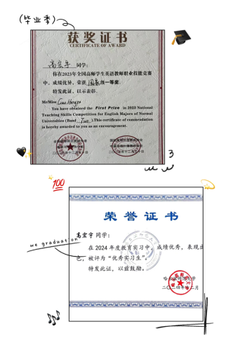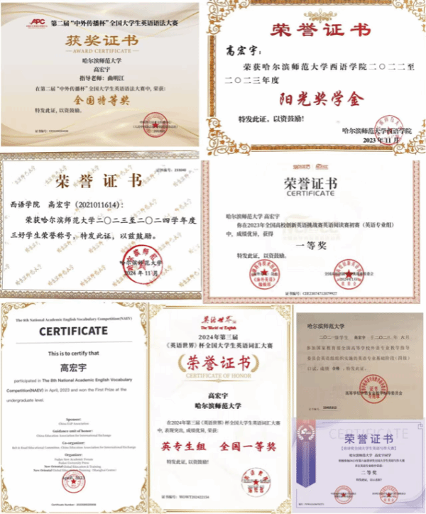 阳光奖学金。曾获英语专业四级笔试良好;英语专业四级口试合格;2023年全国高师学生英语教师职业技能竞赛决赛国家级 一等奖;第二届“中外传播杯”全国大学生英语语法大赛 全国特等奖;2024年第三届《英语世界》杯全国大学生英语词汇大赛英专生组 全国一等奖;2023年第六届普译奖全国大学生英语写作大赛英语专业组 国家级二等奖;2024年全国英语大学生竞赛B类 三等奖等奖项。