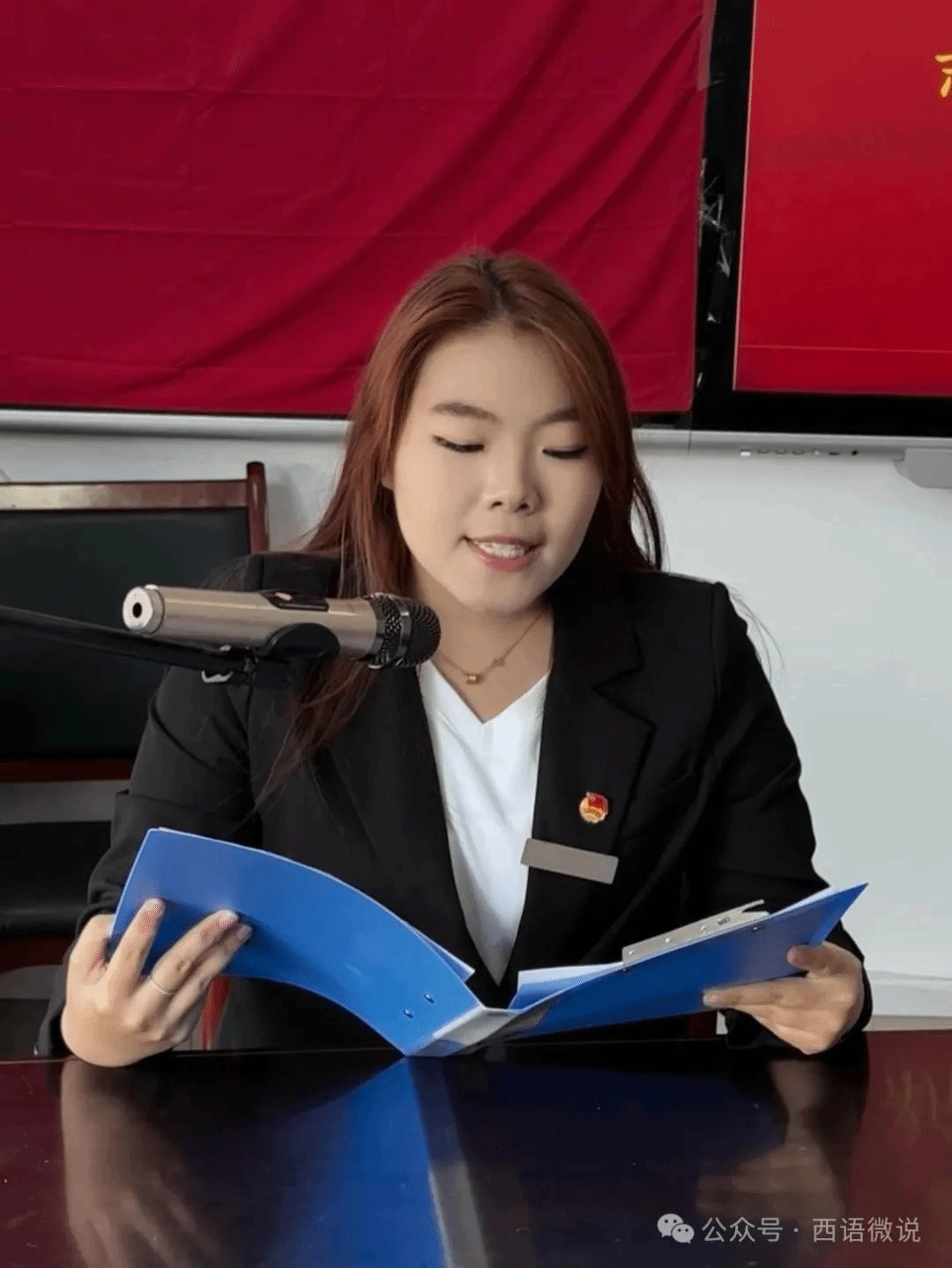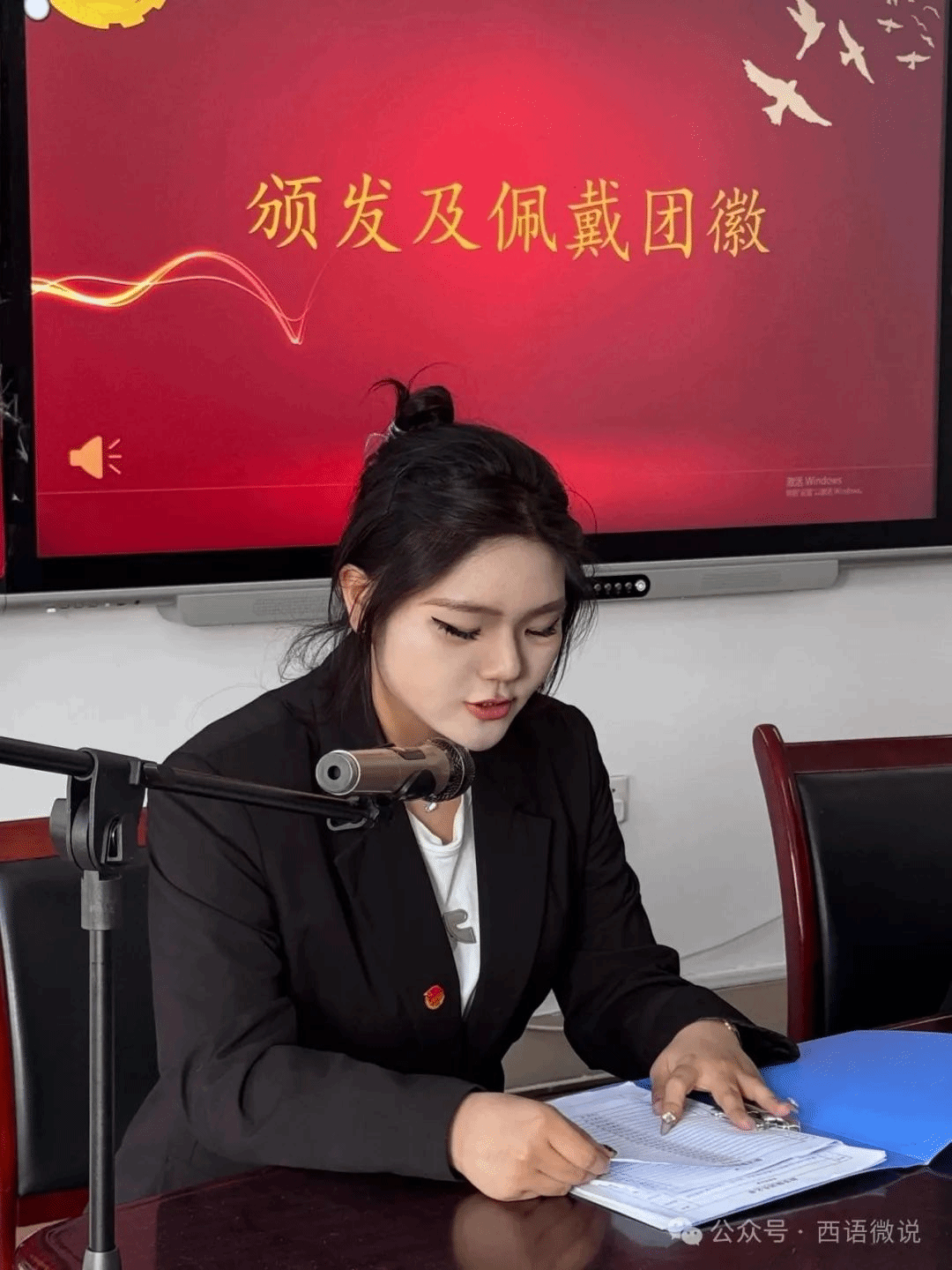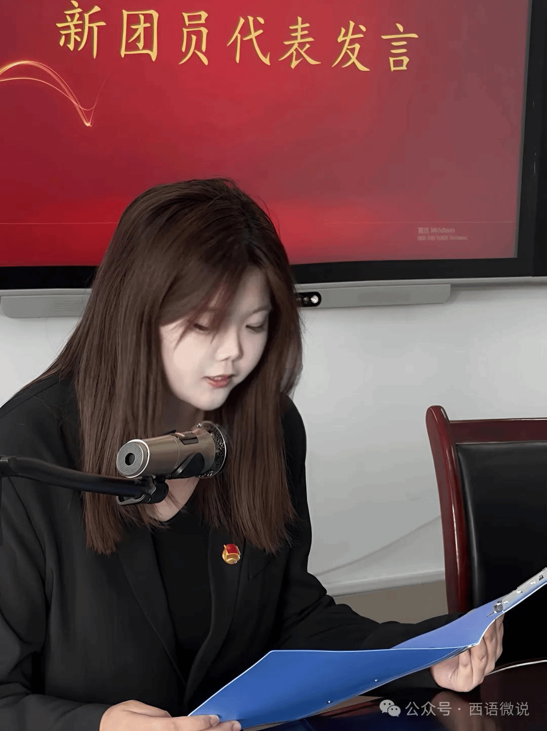大会进行第六项,新团员代表张凯越发言,首先她表示深感荣幸,指出入团是荣誉更是责任。接着她阐述了共青团的意义,号召新团员以高标准严格要求自己,树立理想、履行职责、发挥模范作用。最后她引用总书记寄语,呼吁广大青年听党话、跟党走,立志成为新时代的好青年。