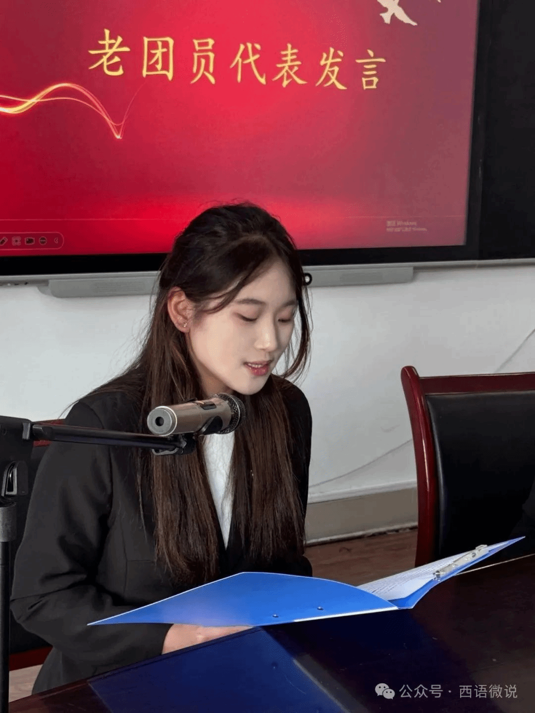 大会进行第七项,老团员代表苏鑫蕊发言,她向新团员表示诚挚的祝贺与热烈的欢迎,她首先强调了共青团的引领作用及团员的光荣使命。随后,她分享了自身的经验,并号召新老团员强化团员意识,树立正确世界观、人生观、价值观,在学习生活中起到模范带头作用,要严格要求自己,提升个人的综合素质。