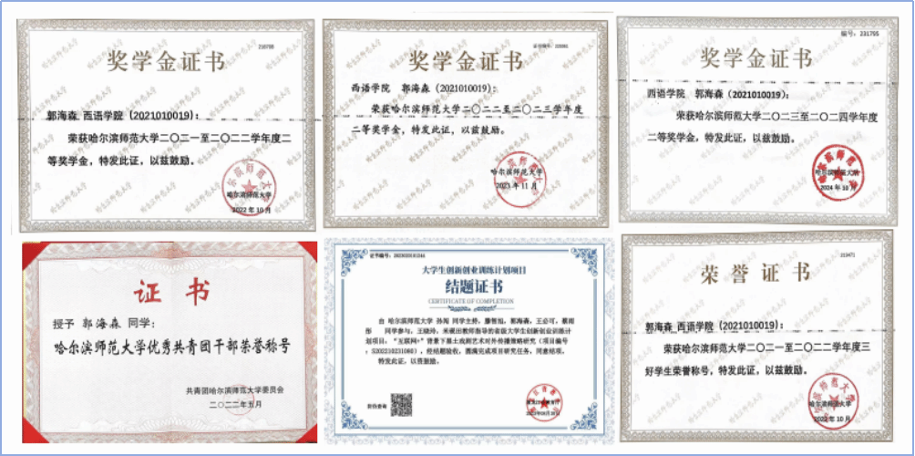 广播电台播音员;曾连续三年荣获校级奖学金,获得“守望者”奖优金、大学生职业生涯规划大赛优秀奖,参与省级大学生创新创业计划项目1项。荣获黑龙江省三好学生、黑龙江省优秀毕业生、校优秀毕业生、校优秀共青团干部,校三好学生、第36届哈夏音乐会优秀志愿者、第九届亚冬会优秀志愿者等多项荣誉。他以坚定的理想信念、优秀的学习成绩和丰富的实践经历,诠释了新时代青年的风采。现已工作签约中国电建市政建设集团。