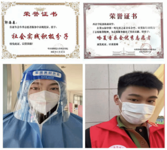 “党员不仅是一种身份,更是一份使命。”郭海森用实际行动践行入党初心。自2021年入学以来,他一直走在志愿服务的路上。从校园核酸检测、防控站岗志愿者,到三下乡社会实践服务志愿者。从哈夏会到亚冬会,他一直用实际行动践行志愿者精神。