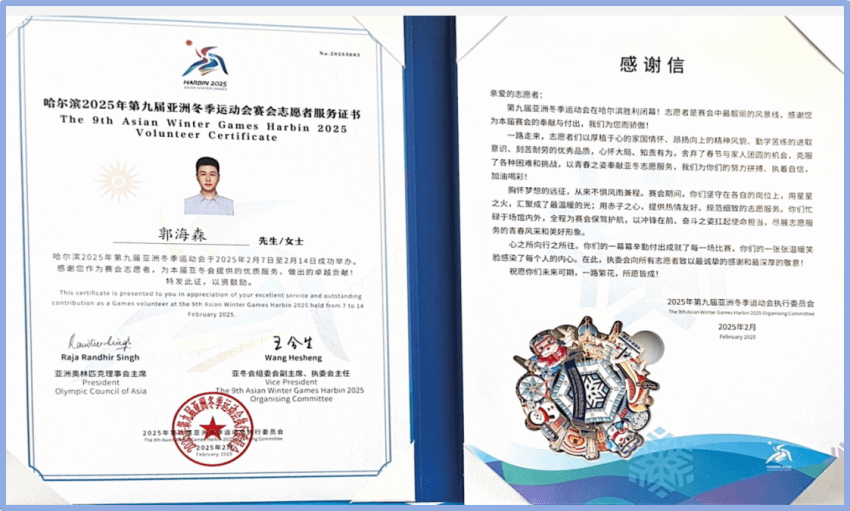 2024年4月,亚冬会执委会从我省5800多名报名志愿者中遴选出44名升旗手,郭海森成功被选为其中一员。从训练到正式上场,历时近一年之久,牺牲了假期和春节,占用了休息时间,坚守训练场,他一刻都不曾懈怠,最终以 “零失误”完成国际性赛事升旗任务,个人事迹获多家媒体报道。凭借着一股为家乡的盛会奉献力量的决心和信念,让他从零基础到站在国际性赛事的颁奖台上。作为升旗手,抬起的国旗是祖国的一角,当国歌奏响,亲手升起五星红旗,所有的苦与泪都在那一刻释然。回望四年的时光,一路走来,他一直用一片赤诚厚植情怀,用实际行动践行初心。