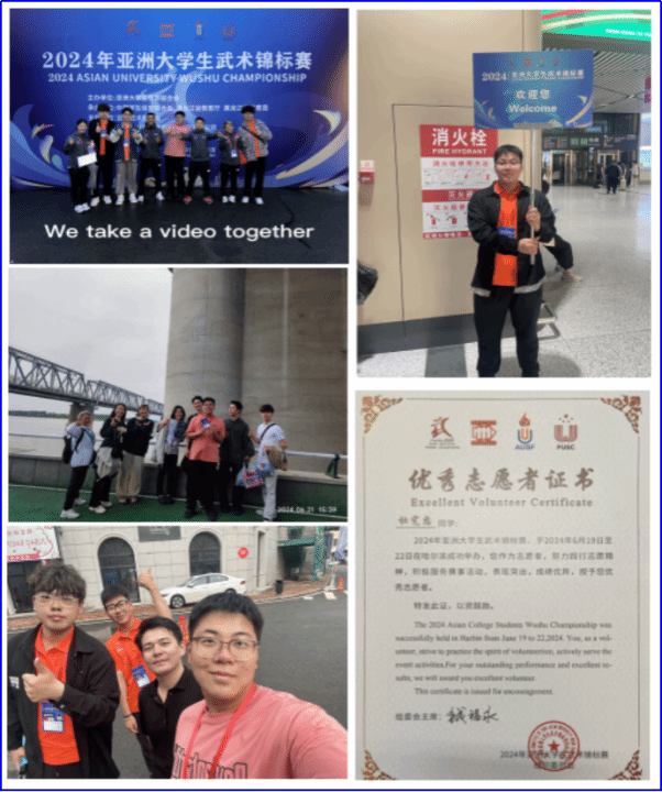 无论是国际赛事舞台上的跨语言服务,还是返乡扶贫路上的英语课堂,他始终相信:语言是连接世界的桥梁,而教育是照亮未来的火种。在亚洲大学生武术锦标赛志愿服务中,杜宪忠担任翻译志愿者,负责沟通协调工作。凌晨1点仍然在哈尔滨太平国际航班楼接机,返回酒店已然3点,5点还需要带领运动员测重等评估环节。面对哈萨克斯坦运动员的英语交流障碍,他主动运用俄语辅助翻译,确保赛事信息准确传达。这段经历让他深刻体会到:“跨语言交流不仅是技巧,更是心与心的联结。”其专业素养与应变能力得到组委会认可,获评“优秀志愿者”。