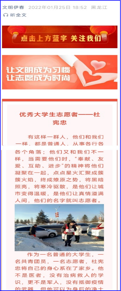 杜宪忠多次参与社会实践:返乡期间走访贫困户,送去生活物资,为儿童辅导英语;在中国国际大学生创新大赛(2024)黑龙江赛区中协助会务工作,展现高效执行力。他被评为伊春市优秀大学生志愿者,事迹被“文明伊春”官媒报道。‘理论学习 + 志愿服务’双轨模式。
