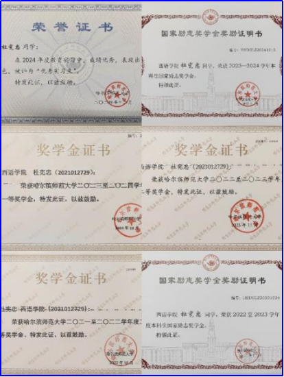 在专业学习上,杜宪忠始终秉持踏实严谨的学风。在校期间综合测评成绩位列年级第15名(前5%),专业成绩排名第28名(前8%),31门课程成绩达90分以上;连续三年获得国家励志奖学金、校奖学金;在全国性竞赛中表现突出,获第二届“中外传播杯”全国大学生英语语法大赛三等奖、第九届“复旦社杯”大学生英语词汇赛优胜奖;注重实践创新,参与黑龙江省2023年大学生创新创业训练计划,完成课题研究并获省级立项。凭借扎实的学术积累,他成功推免至本校iqqtv