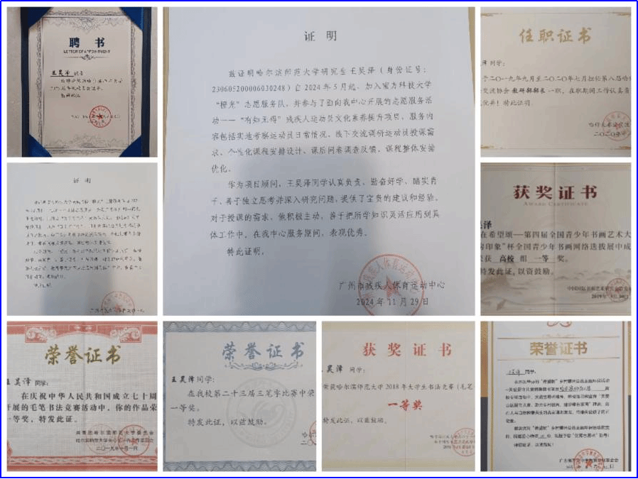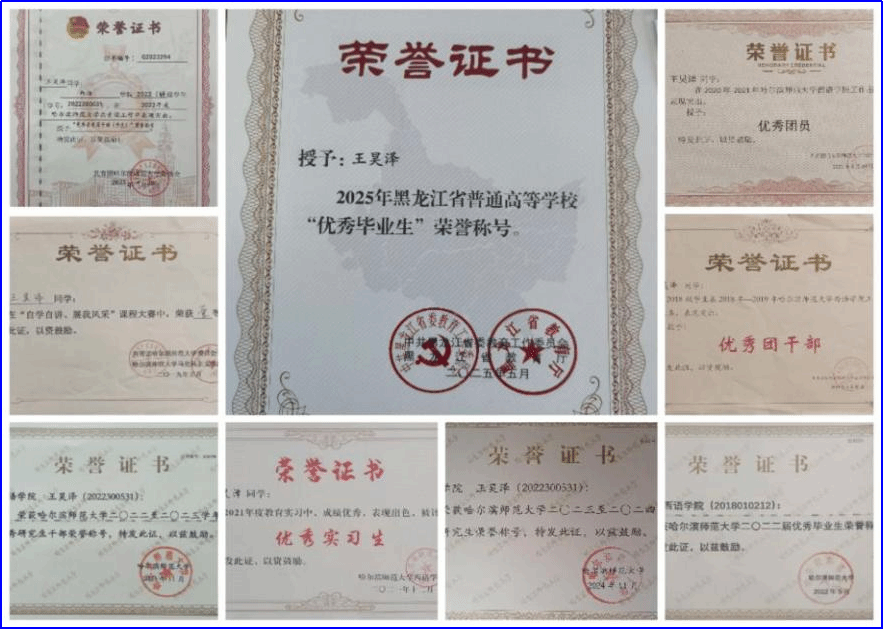 2019-2025年期间,分别荣获院级“优秀团干部”“优秀团员”“优秀实习生”校级“优秀研究生干部”“优秀毕业生”省级“优秀毕业生”等荣誉称号。