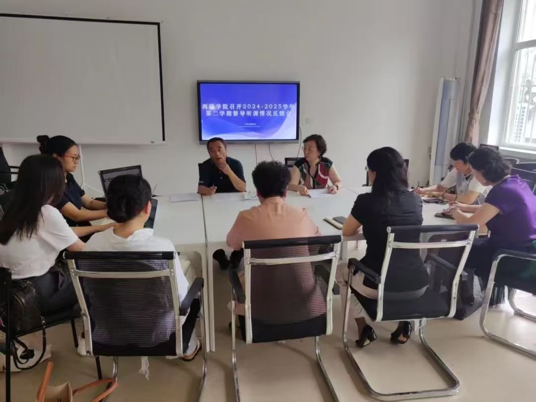 两位督导首先对本学期的听课情况做了整体介绍,分别从教学文件、课堂听课等方面进行反馈。校督导肯定了学院的教学工作质量在稳步提升,老师们授课态度端正,都能够提前进入教室,备课充分,教学文件齐全,教案设计越来越规范,专业素养不断提高,知识储备丰富,课堂教学活动组织多样化,注重理论与实践相结合,充分训练学生实践能力,利用混合式教学评价模式完善教学质量。两位督导还反馈了外教的授课情况,对外教评价极高,外教的实训活动丰富,课堂内容充实,教学任务与学生出国学习的课程衔接度较高。外教还积极参与学院的第二课堂活动,以赛代练,有益于对学生语言意识的培养。