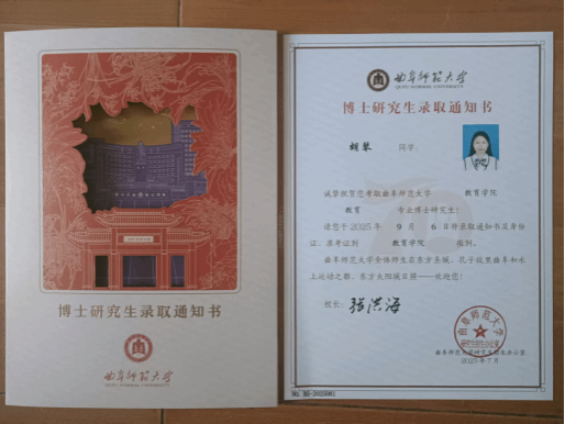 继我院三名2021级硕士研究生考取全国重点高校博士研究生之后,2025年7月,从曲阜师范大学传来喜讯,我院 2022届学科教学(英语)专业硕士研究生胡琴同学凭借扎实的学术功底与不懈的努力,成功考取该校教育专业博士研究生,研究方向为学校课程与教学。