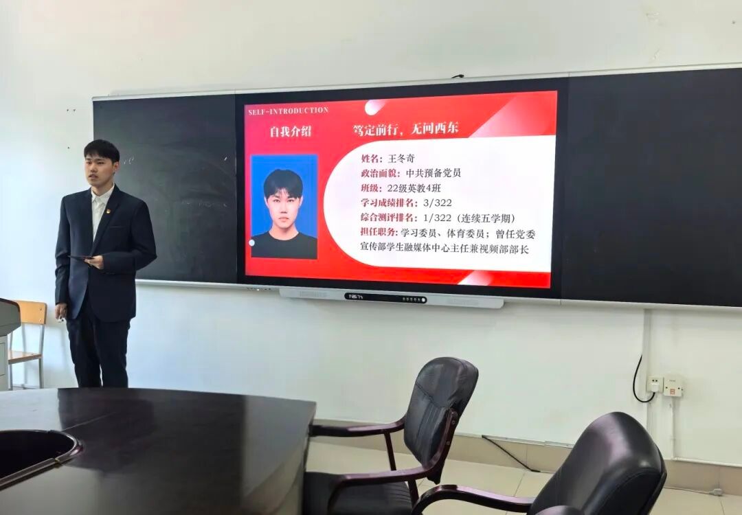 参加本次联评答辩的候选人有2022级英教一班纪苏函、英教四班王冬奇、商英一班王宇斐、2023级英教六班费琢皓、法语二班沈禹彤、商英一班李佳琪、2024级西班牙语二班尹航。候选人依次从专业能力、学业获奖、创新创业、文体活动和社会实践等方面进行3分钟的阐述。而后由各位评委结合国家奖学金申报条件和学生的综合情况进行投票。经工作人员统计,最终产生5名正式推荐人选和1名备选人选,依次为:纪苏函、费琢皓、王冬奇、沈禹彤、王宇斐、尹航(备选)。