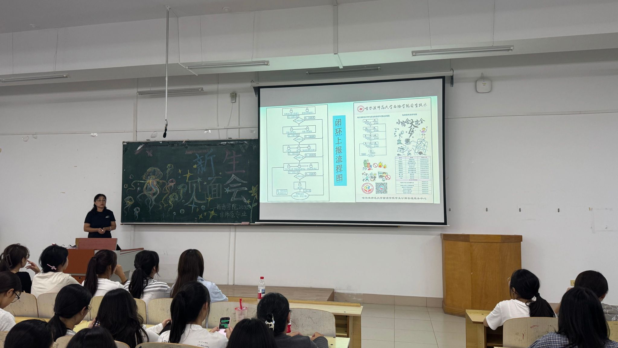 于9月7日晚18:00在西语楼451、503、551教室举行2025级英语师范与非师范专业新生见面会暨开学第一课。本次活动由2025级新生辅导员杨晓明、魏一扬主讲。