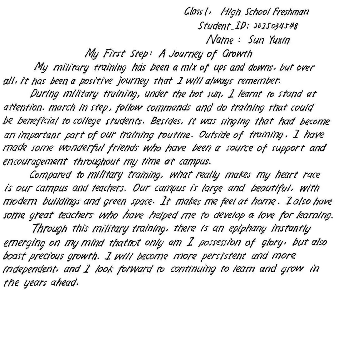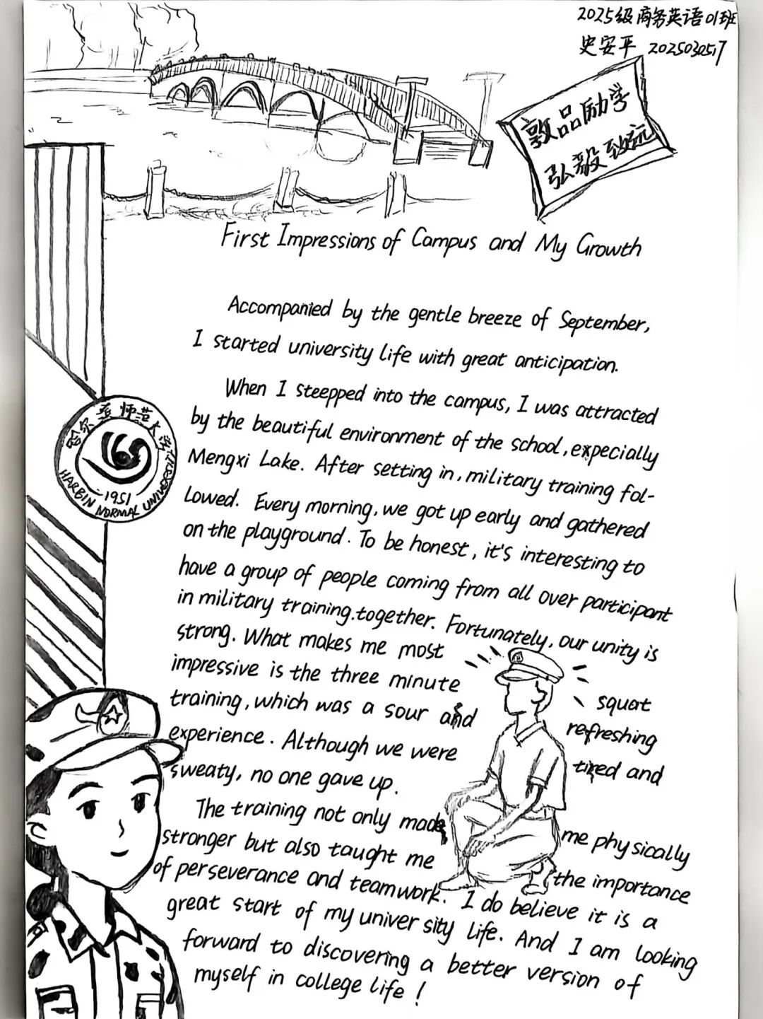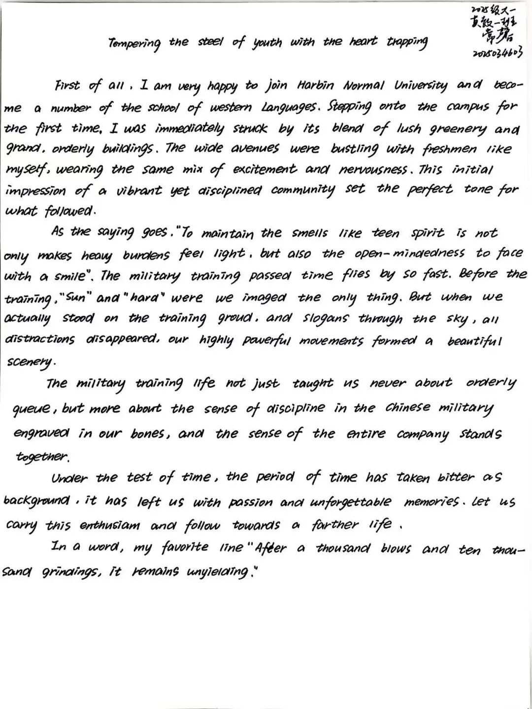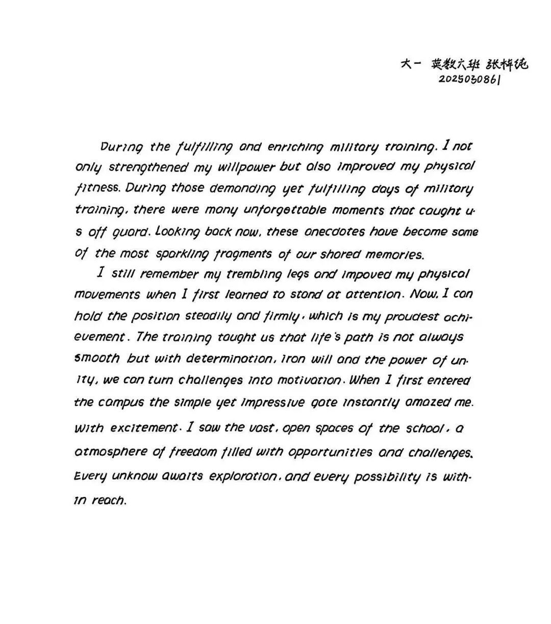 接下来让我们一同走进赛道一英文写作的精彩世界,欣赏西语学子用英文笔触描绘的军训故事与青春感悟。