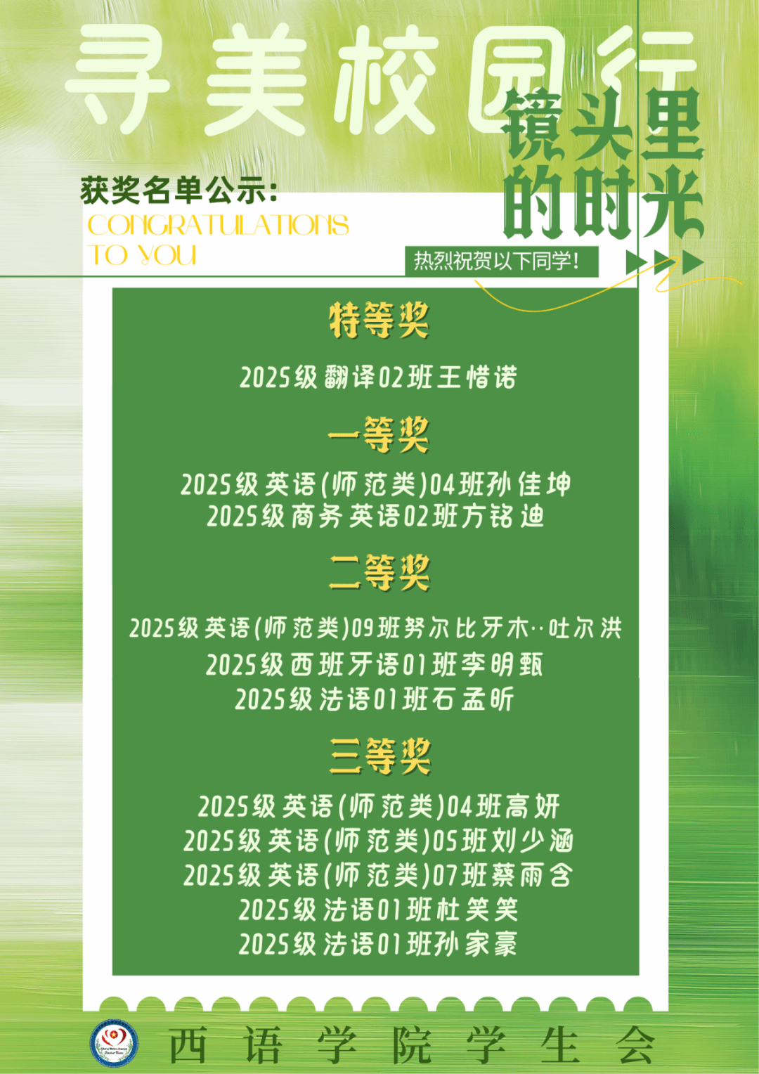 镜头会老去,照片会泛黄,但那一刻,你为一片云驻足、为一朵花低眉、为一束光惊叹的心动,将永远年轻,成为你大学生活里最晶莹的琥珀。感谢每一位参与其中的同学,你们不仅是比赛的选手,更是校园的诗人,用快门作笔,将平凡的日常谱写成动人的诗篇。