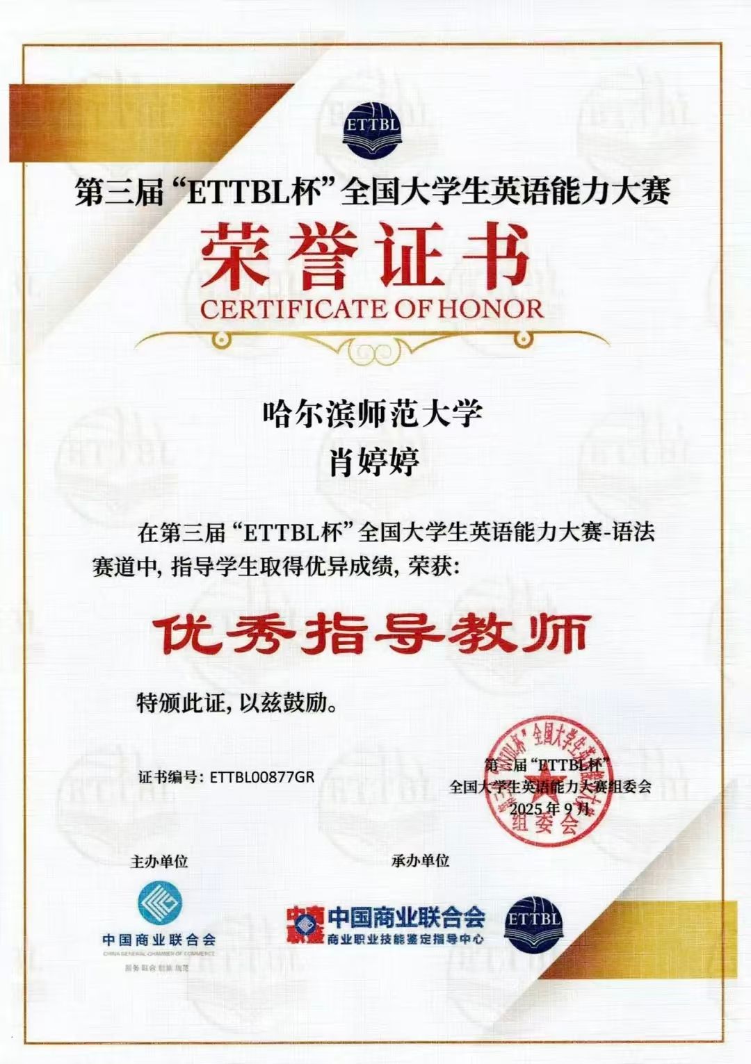 同时,肖婷婷老师凭借着多年沉淀的丰富教学经验和扎实专业的指导能力,荣获“优秀指导教师”称号。