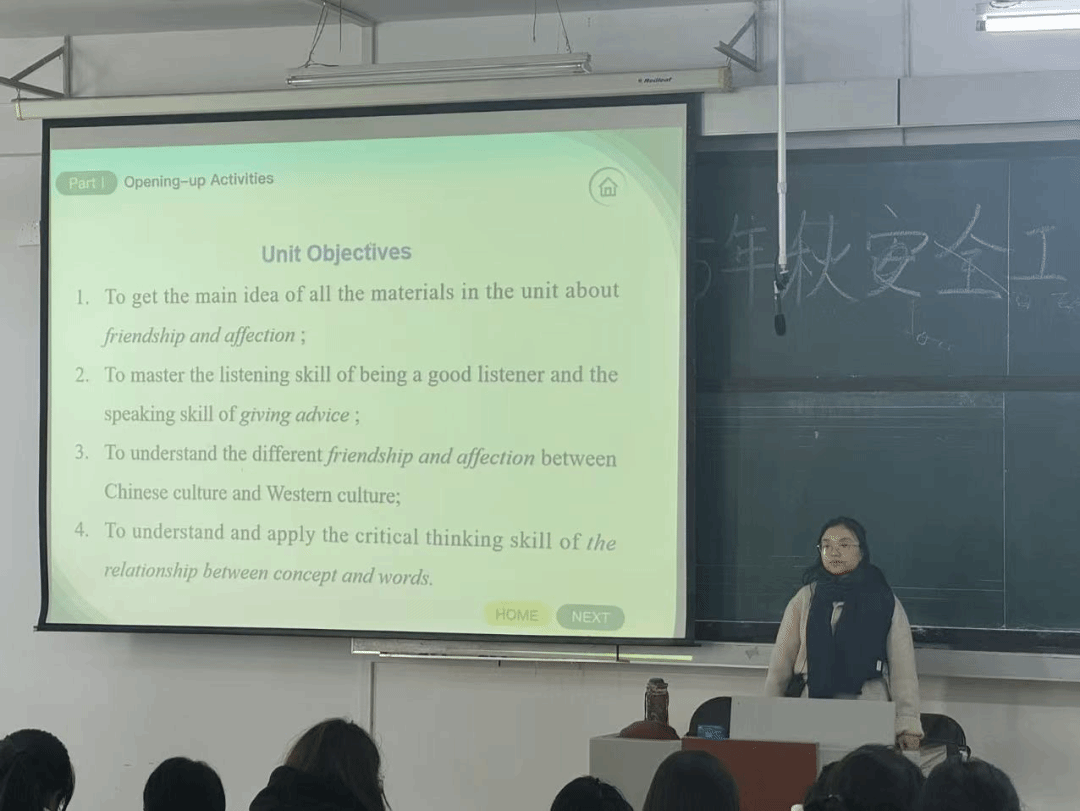 10月23日,学术英语系于虹主任讲授第四单元 “Campus”,紧密贴合大一学生的校园生活场景与语言学习需求,深度融合省级一流课程 “知识、能力、素养” 三维培养目标,整体框架完整、逻辑清晰、设计细节扎实。从课程定位到教学反思均体现 “学生中心、情境导向、成果导向” 的现代教育理念,能够有效支撑《大学英语》综合应用模块的教学目标达成,教学设计规范化、教学内容精准化、教学方法多样化、教学评价多元化。