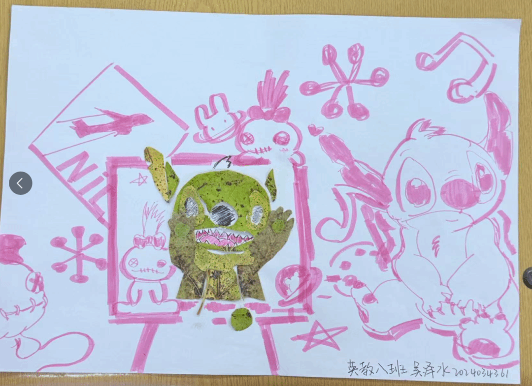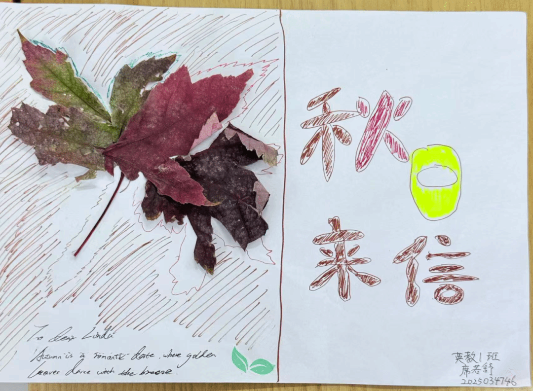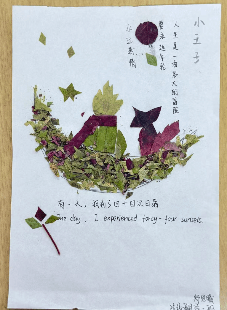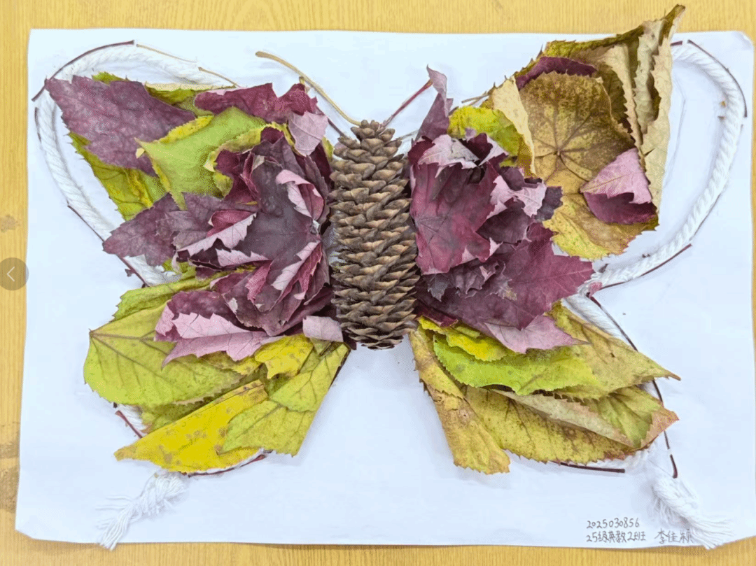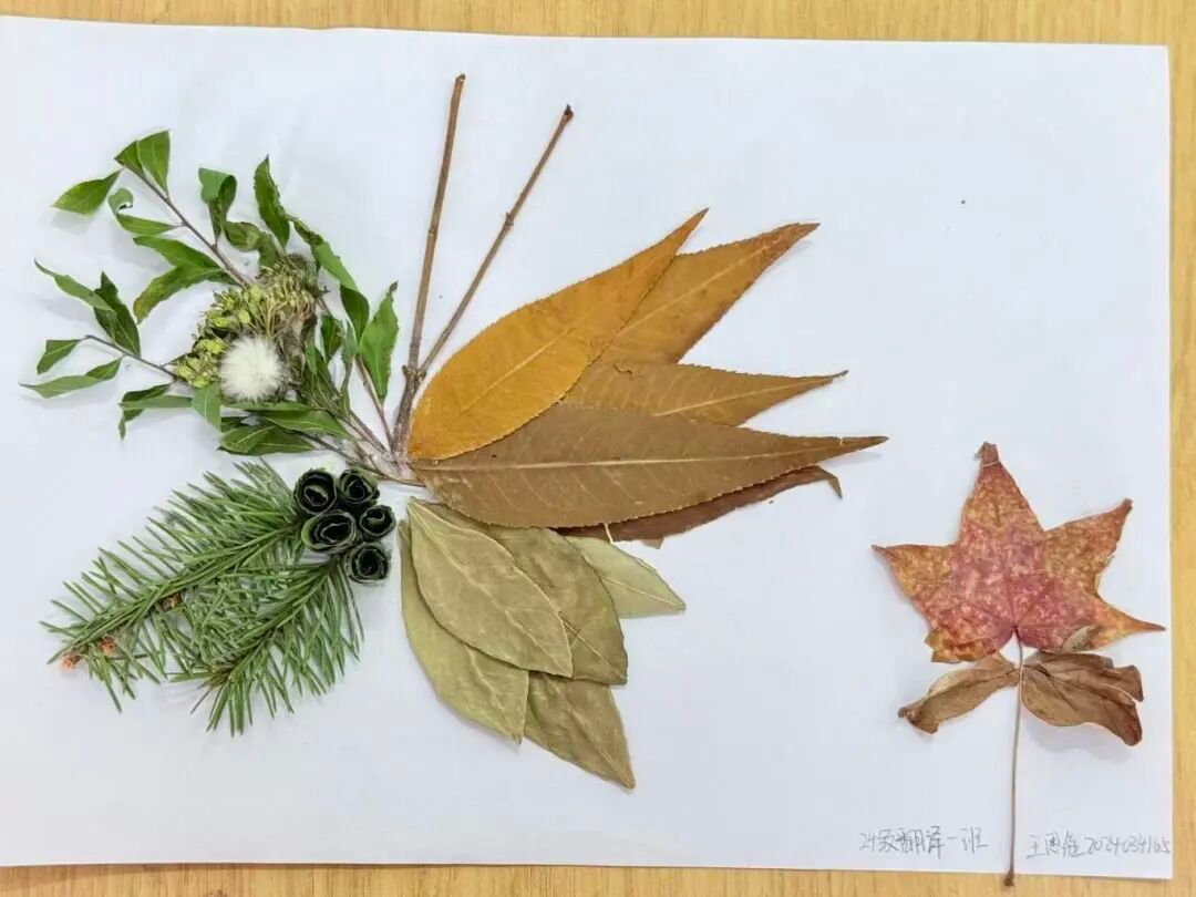 同学们的树叶贴画作品色彩丰富、创意十足,从秋日小熊、小王子形象,到旗袍、蝴蝶结造型,每件作品都巧妙运用不同形状与颜色的树叶,结合文字与线条,生动展现季节之美与艺术巧思,既体现了对自然材料的巧妙运用,也彰显了同学们的创造力与动手能力。