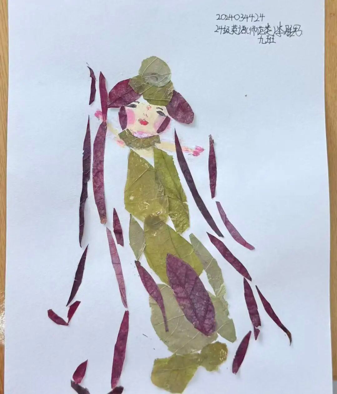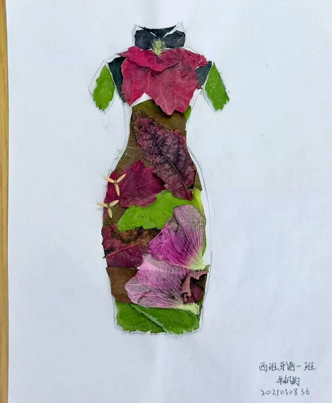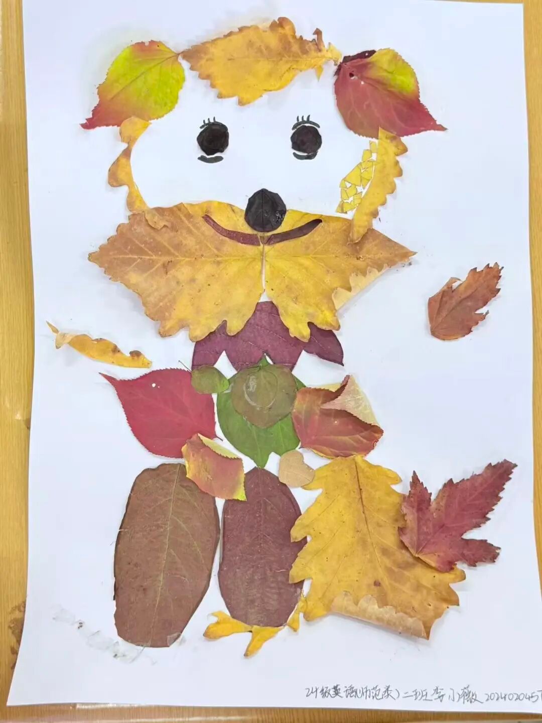 同学们的树叶贴画作品色彩丰富、创意十足,从秋日小熊、小王子形象,到旗袍、蝴蝶结造型,每件作品都巧妙运用不同形状与颜色的树叶,结合文字与线条,生动展现季节之美与艺术巧思,既体现了对自然材料的巧妙运用,也彰显了同学们的创造力与动手能力。