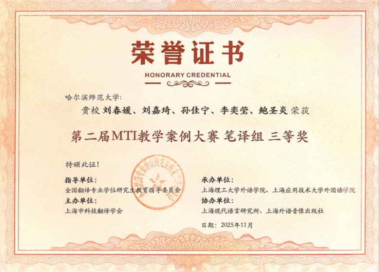 此次佳绩的取得,是我院坚持“以赛促教、以赛促学”理念取得的扎实成果,充分印证了学院在提升MTI教育质量与创新能力方面的切实成效。通过参与高水平的教学竞赛,我院教师不仅展示了风采,更在与同行的交流中汲取了宝贵经验。这一荣誉,为持续深化翻译人才培养模式改革注入了动力,也标志着在培养高素质、应用型翻译人才的道路上又迈出了坚实一步。未来,将继续深化案例教学研究与推广,将大赛成果反哺于日常教学,不断提升MTI人才培养质量,培养契合新时代需求的高层次、应用型、专业化翻译人才。