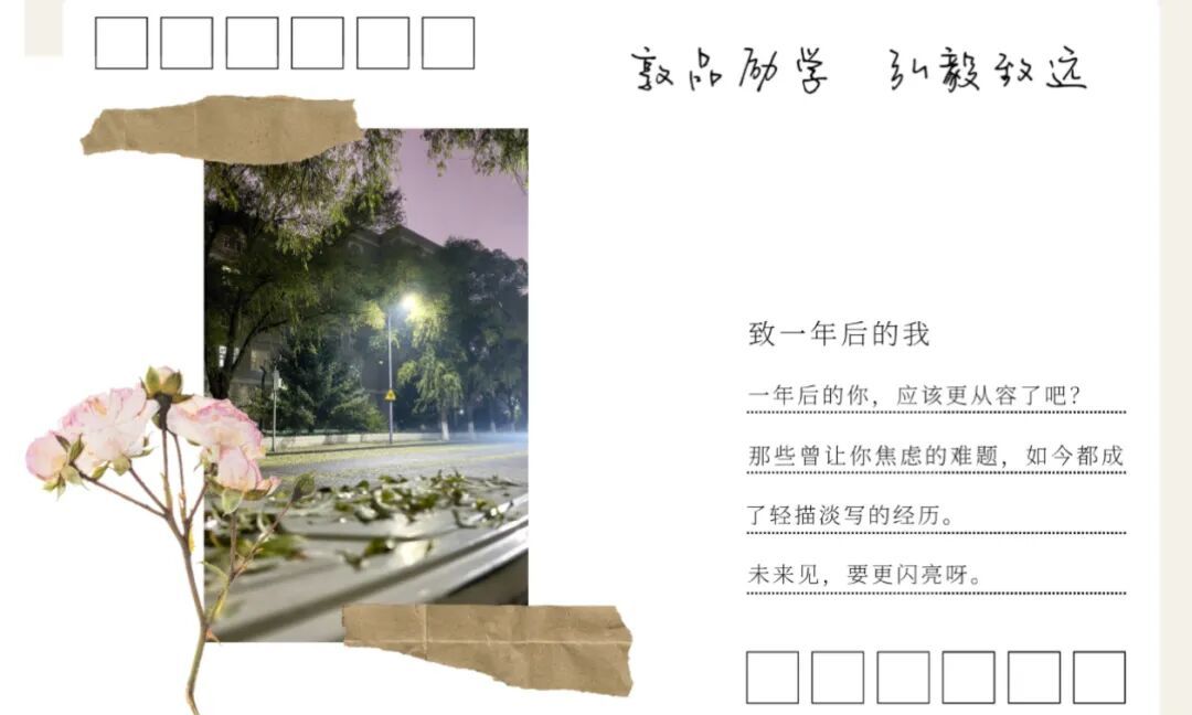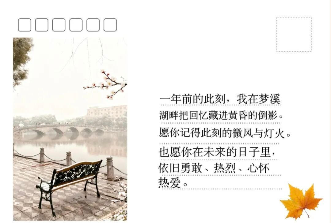 当第一片秋日的落叶落在案头,当笔尖摩挲纸张的沙沙声与心跳同频,你是否曾在某个瞬间,想对未来的自己道一声期许?当晨光为图书馆的窗棂描上金边,当午后的风掠过操场扬起衣角,当暮色将校园染成温柔的橘......把当下的憧憬与热忱,凝注于一方小小的明信片,寄往一年后的时光彼岸,也寄往青春最耀眼的绽fun时刻。
