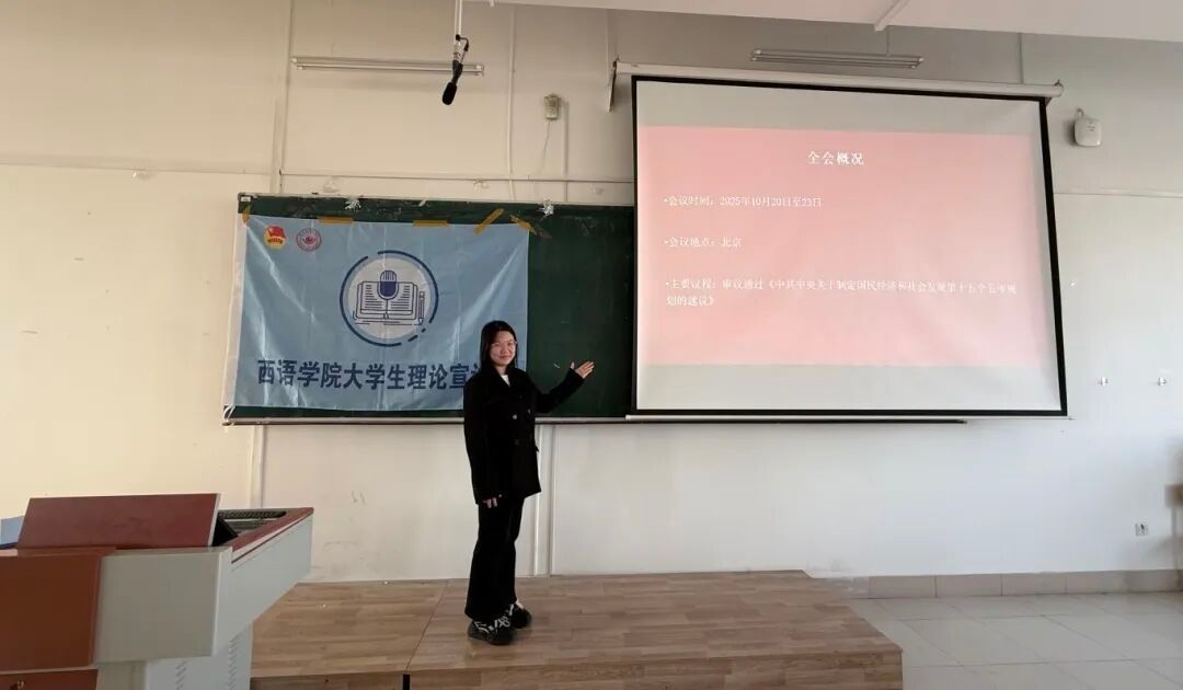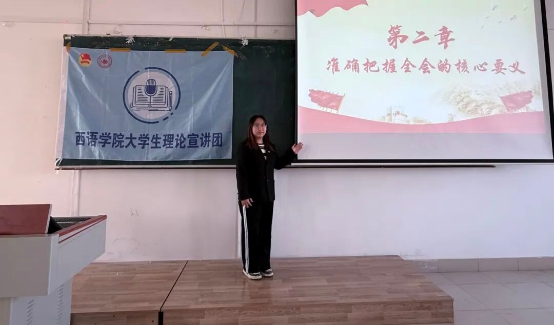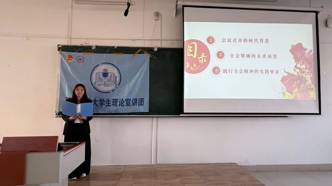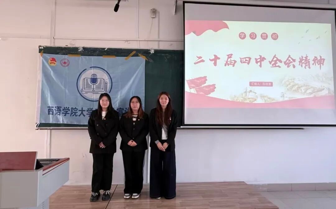 第三届大学生理论宣讲团于11月12日在西语楼503教室开展了以“党的二十届四中全会”为主题的第一期宣讲活动。本次活动由宣讲团团长吕欣泽,副团长陈安琪,苗程程三位同学进行宣讲。