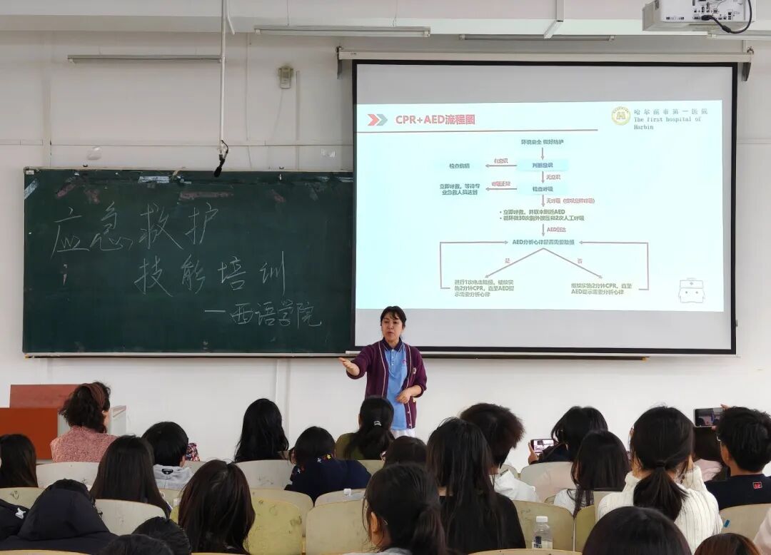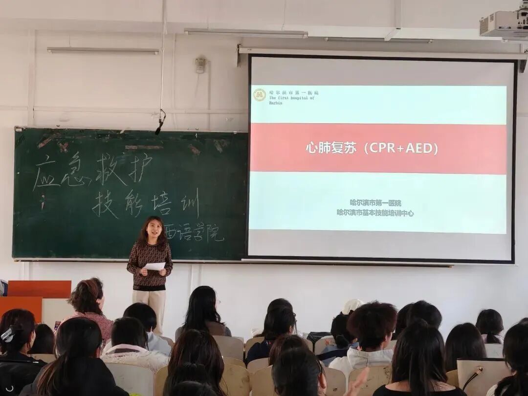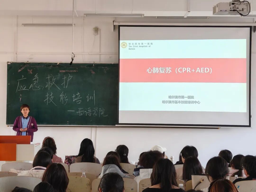 于11月12日13:30在西语楼503举行应急救护技能培训,特邀哈尔滨市第一医院及哈尔滨市基本生命支援技能培训中心专家侯凤雪、闫颖、李艳坤入校讲座。学院师生共150余人参加培训。